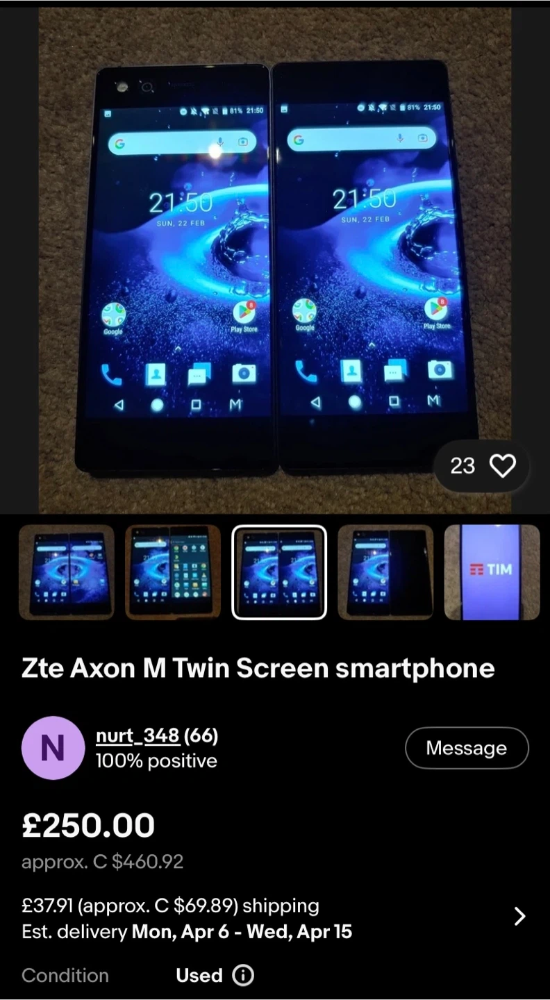 Here's my pretty rare ZTE Axon M Z999 64GB Carbon Black 64GB (2017) android in overall good cosmetic condition, with microscratches on the display, slight dents on the right aluminum side, though no other damage.