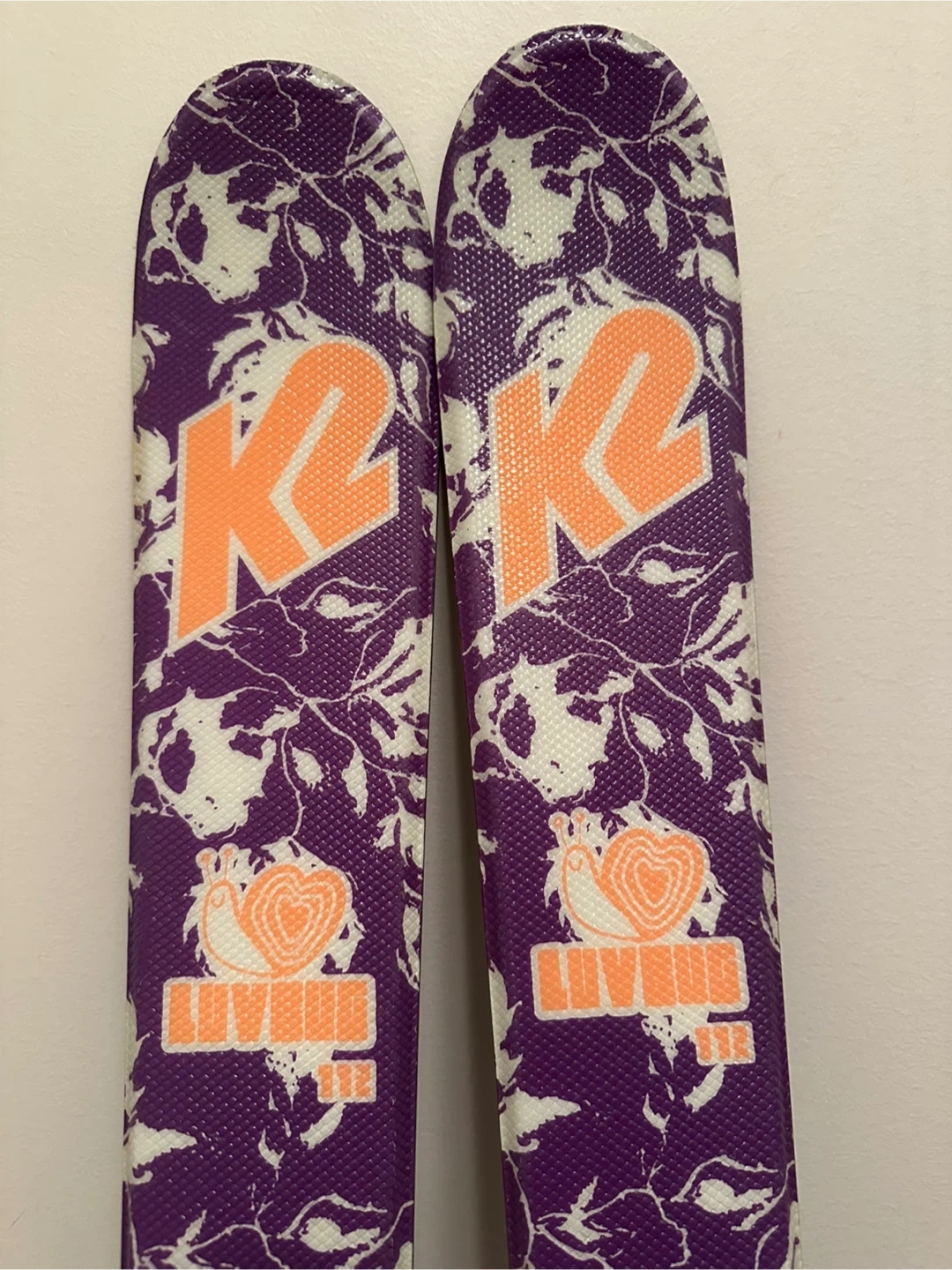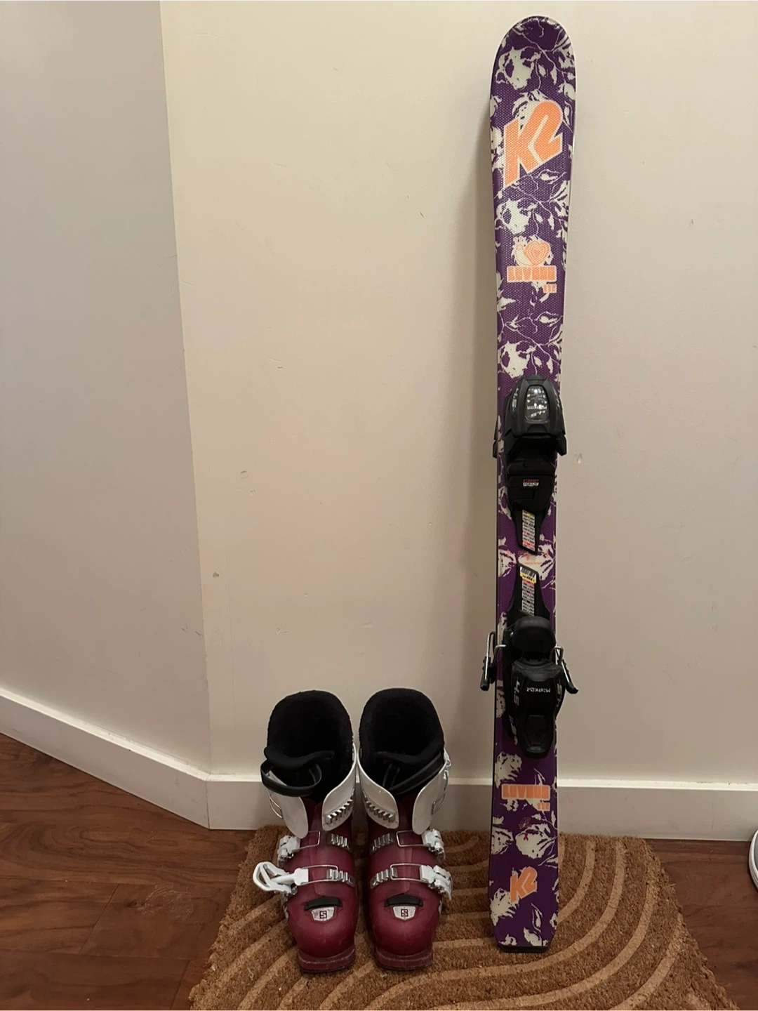 K2 Luv It skis with Marker 4.5 bindings + Salomon ski boots (size 22–22.5 / 265mm).