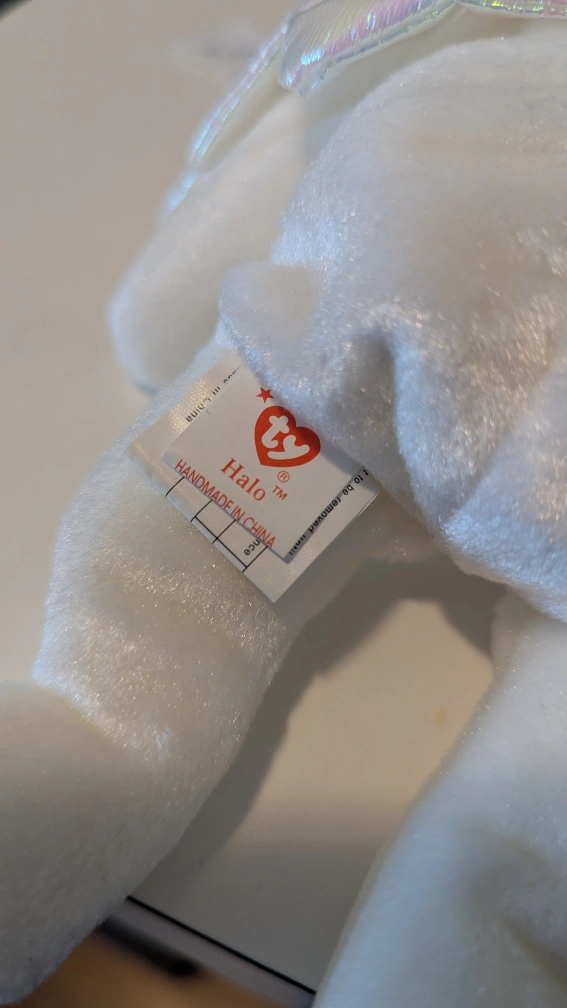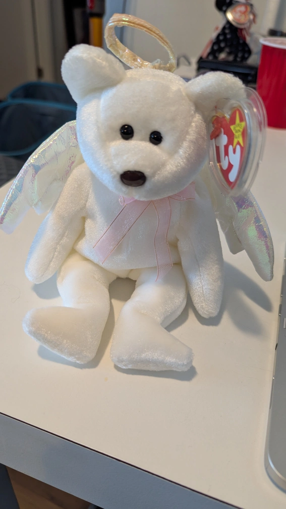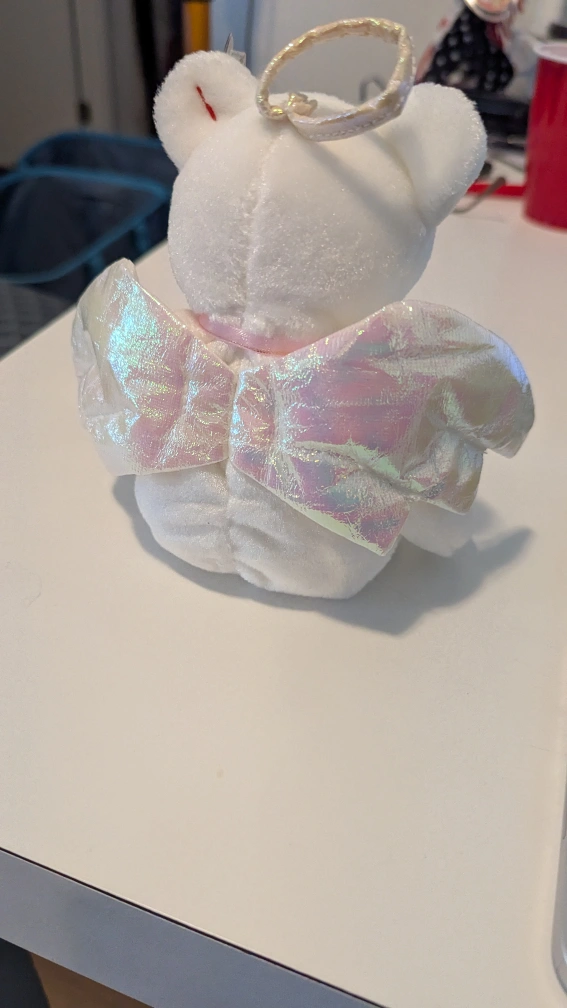 Adorable white bear with iridescent wings and halo. Pink ribbon accent. Collectible Beanie Baby. Kept in protective case