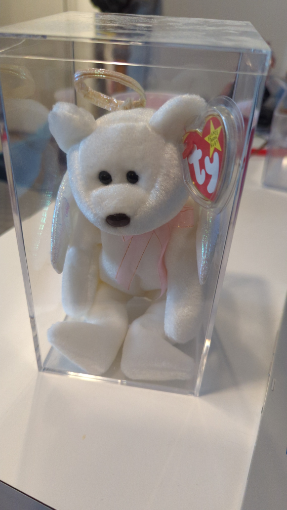 Adorable white bear with iridescent wings and halo. Pink ribbon accent. Collectible Beanie Baby. Kept in protective case