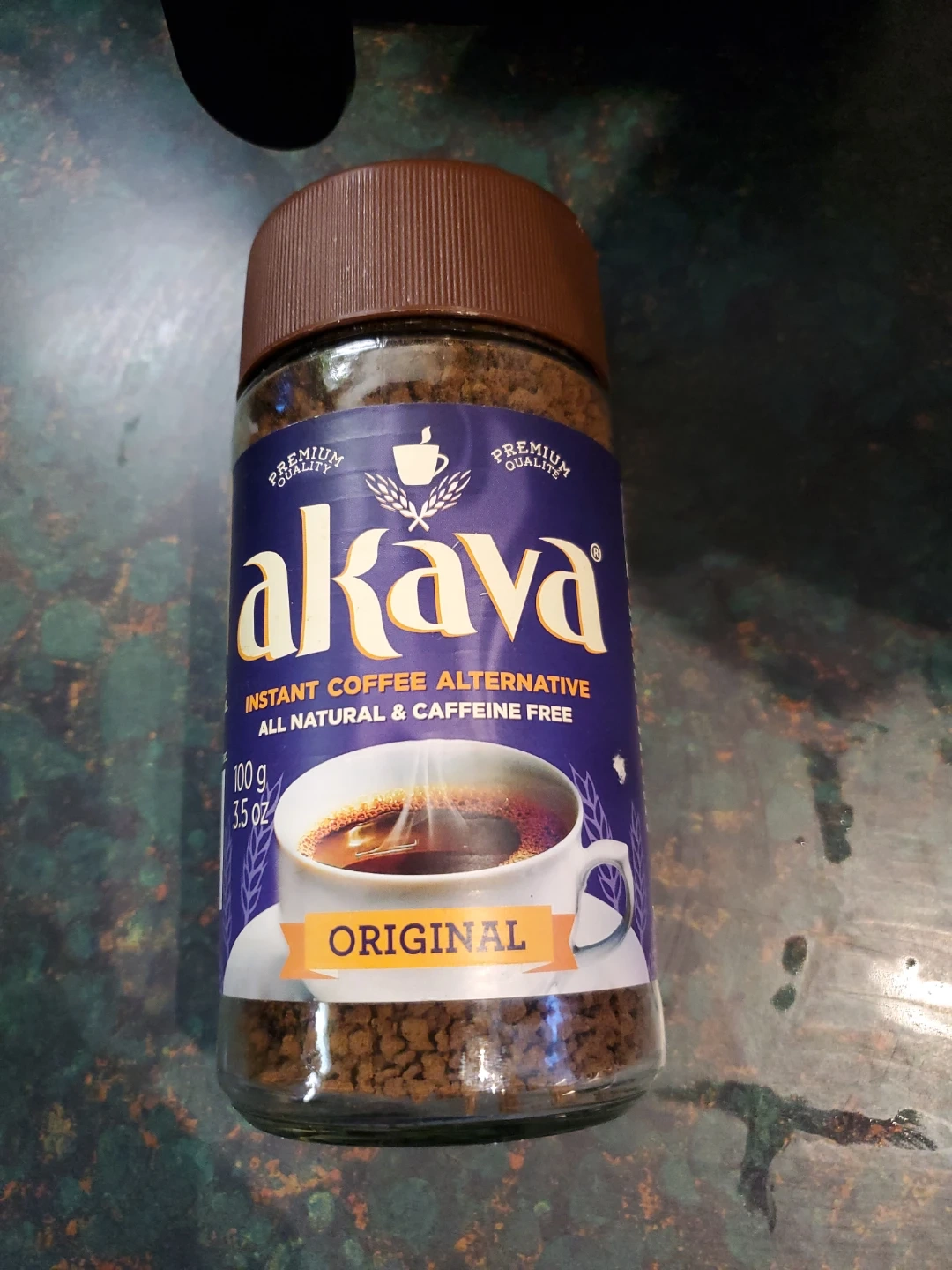 Akava is an all-natural, caffeine-free instant coffee alternative. It's made from barley, rye, chicory, and sugar beet. Dissolve two rounded teaspoons in one cup of hot water for a coffee-like beverage. Cedar pick up.