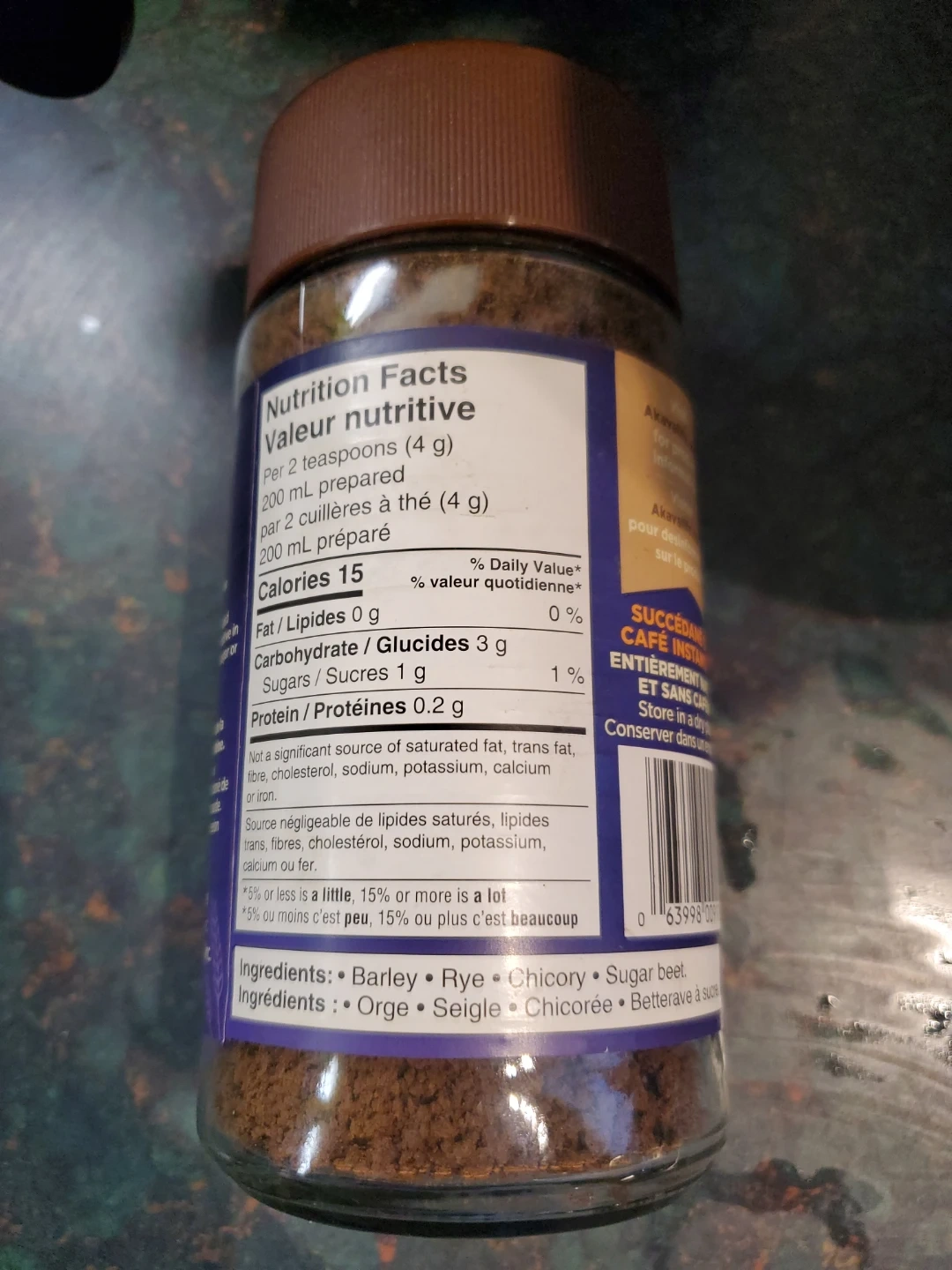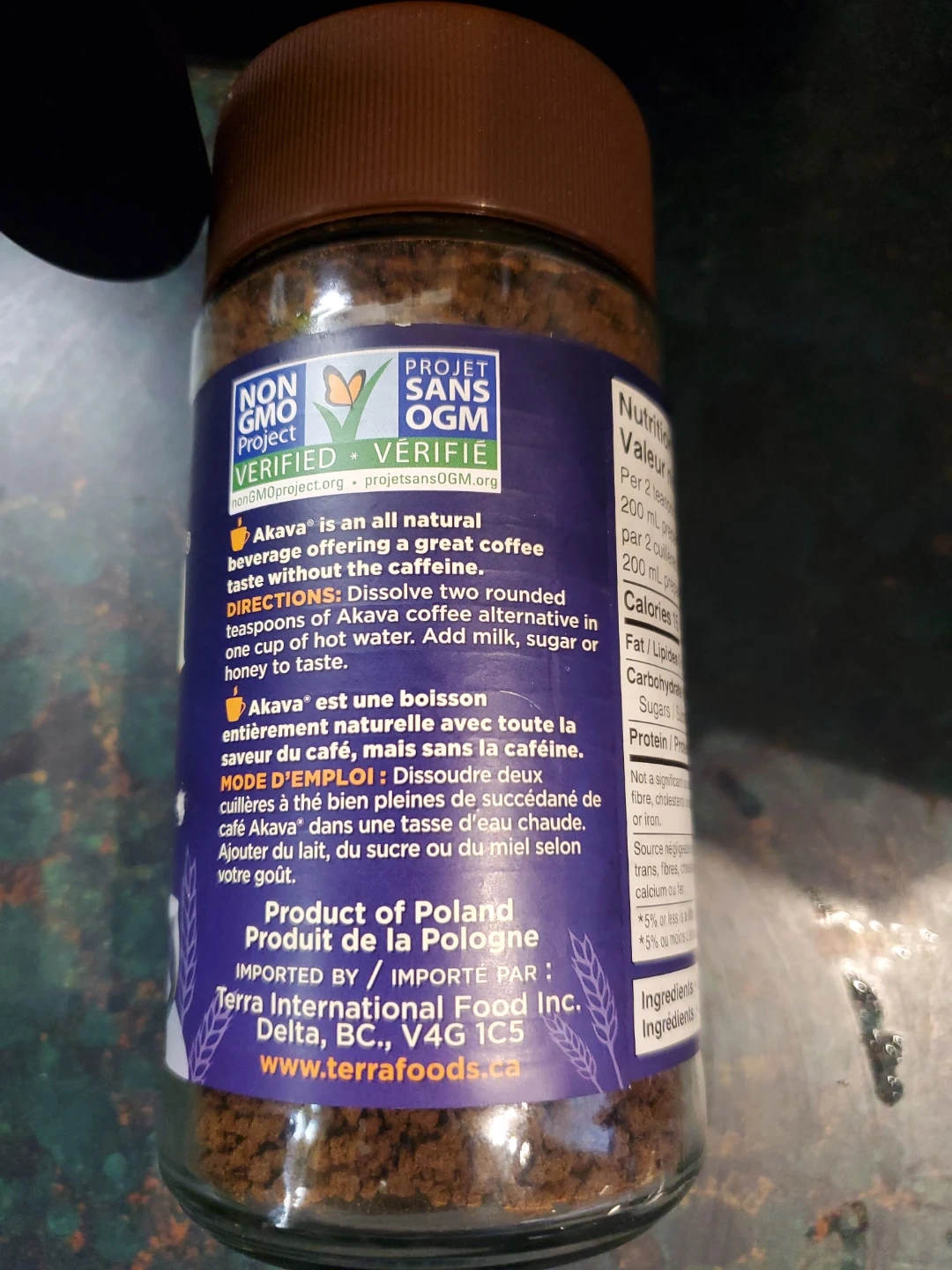 Akava is an all-natural, caffeine-free instant coffee alternative. It's made from barley, rye, chicory, and sugar beet. Dissolve two rounded teaspoons in one cup of hot water for a coffee-like beverage. Cedar pick up.