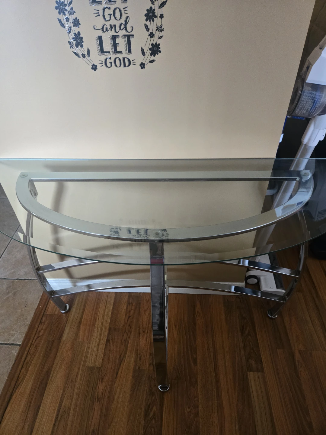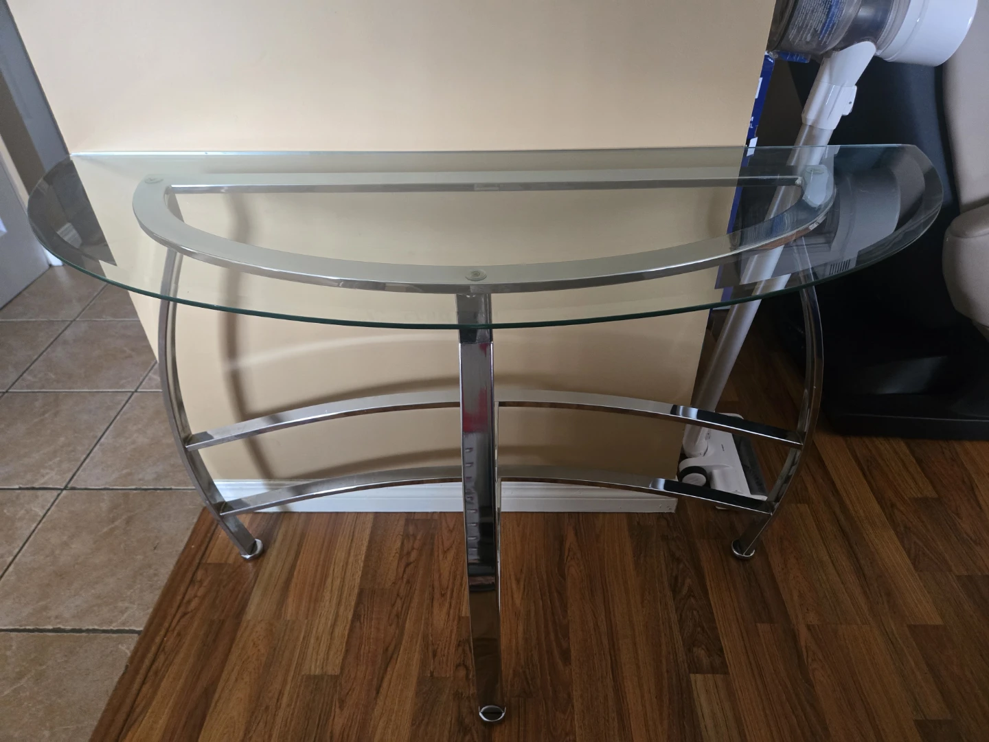 This console table features a sleek half-moon glass top and a shiny chrome frame with curved accents. Its unique design makes it a stylish addition to any hallway or entryway. The open shelf underneath provides extra space for decorative items or storage.