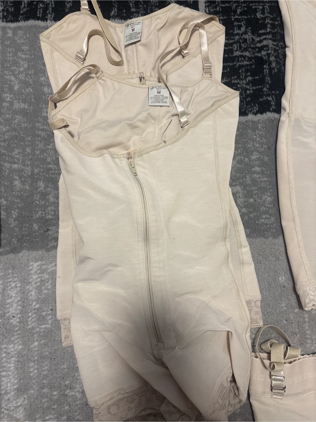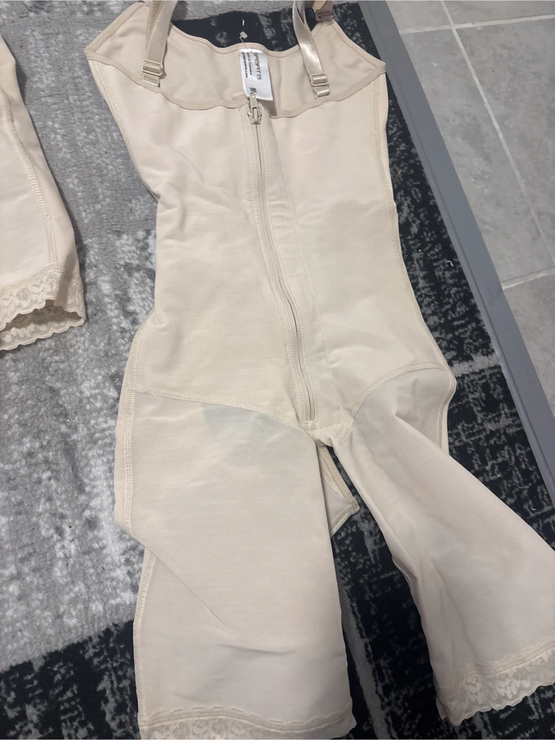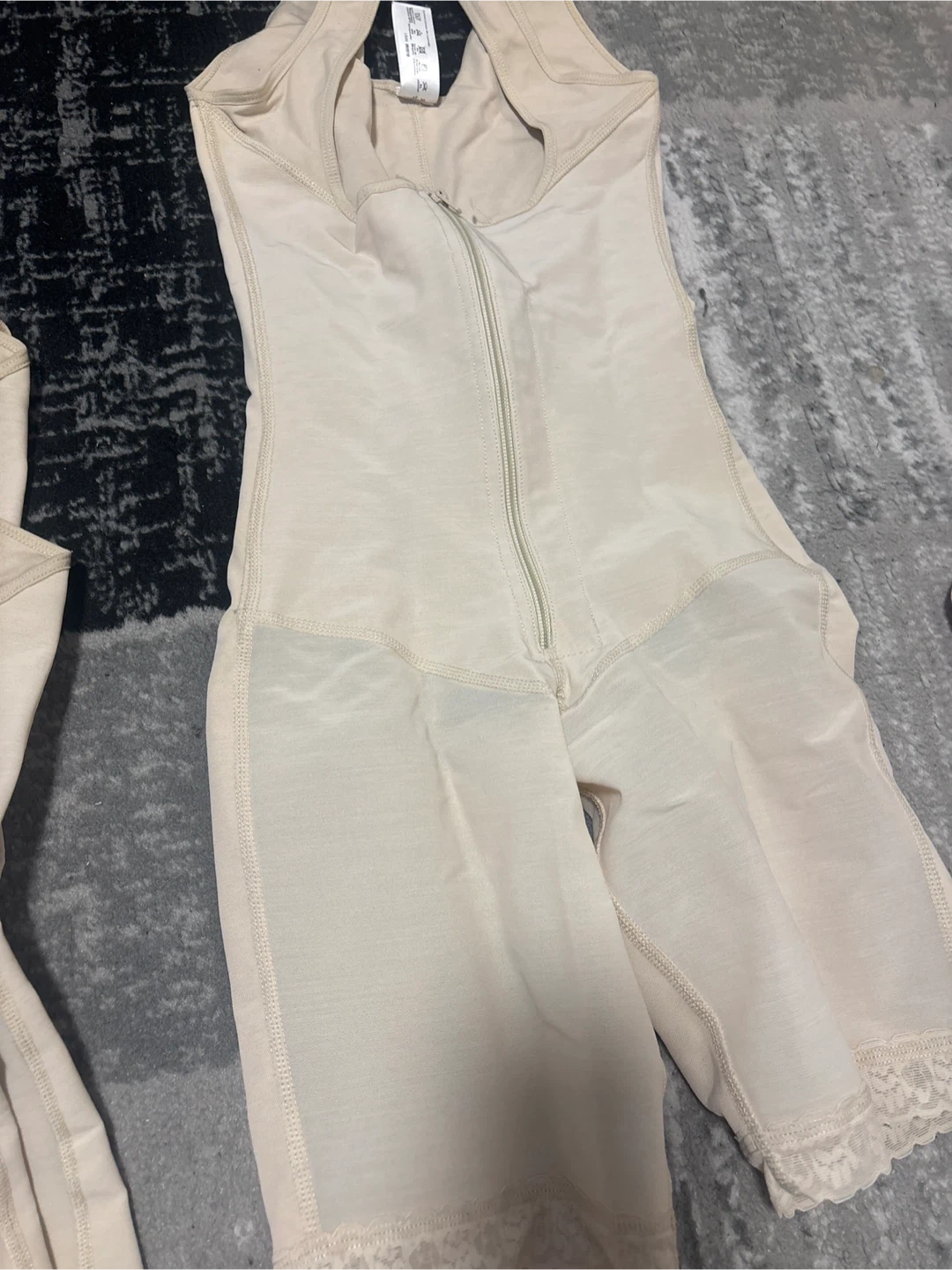 This beige Maidenform full body shaper bodysuit features a zipper front and adjustable straps. It's made of a smooth, stretchy fabric for comfortable shaping. The leg openings have a lace trim. It also has a hook-and-eye gusset closure. Perfect for smoothing your silhouette under dresses or skirts! 20$ each one price is negotiable if buy all or several.