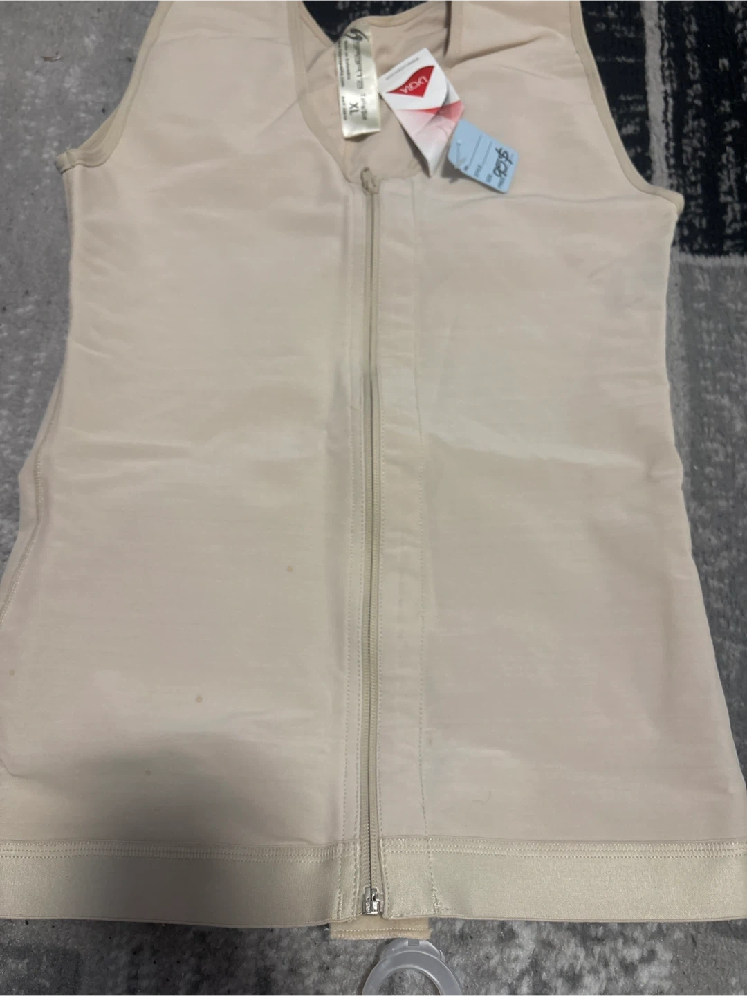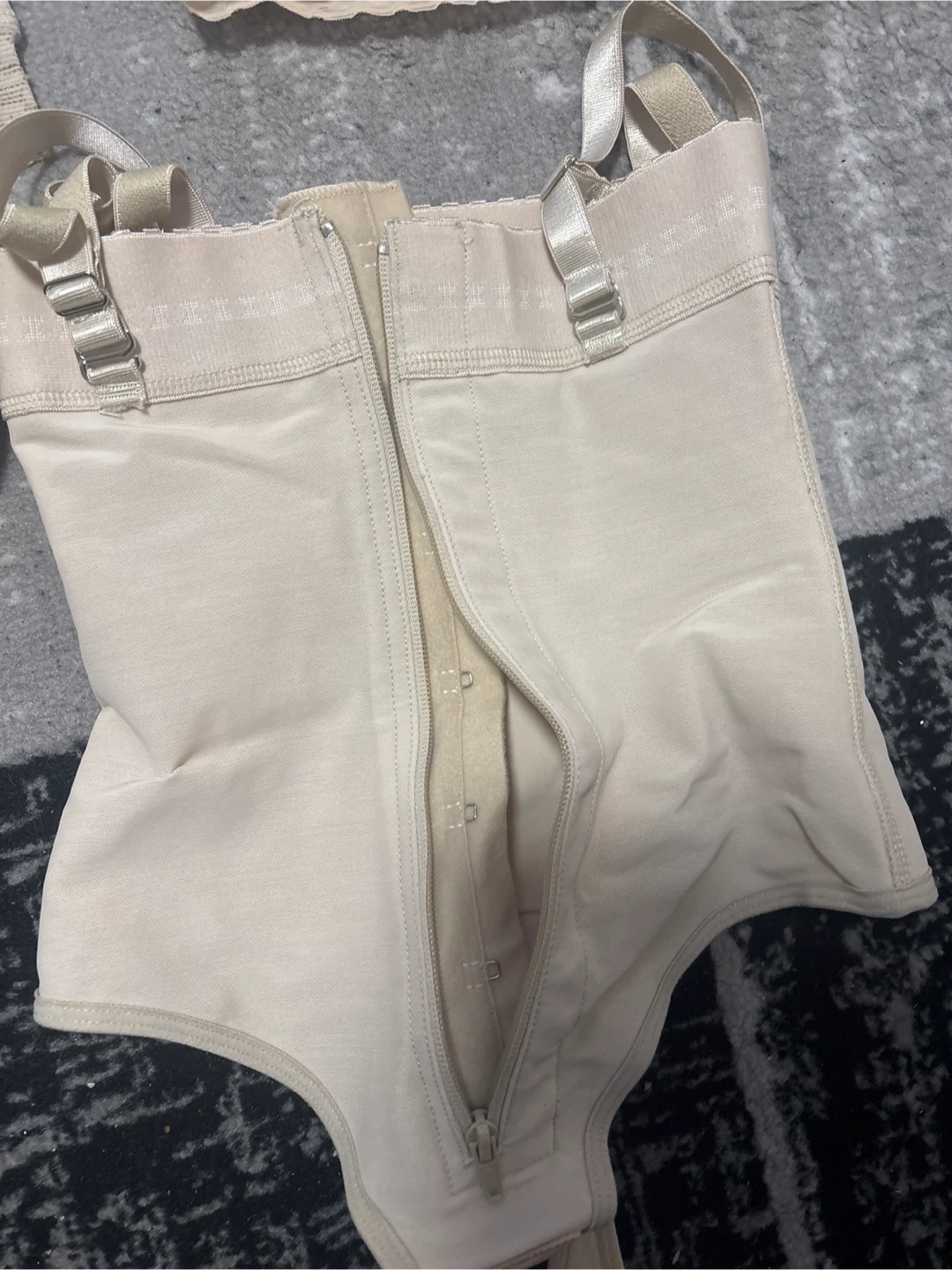 This beige Maidenform full body shaper bodysuit features a zipper front and adjustable straps. It's made of a smooth, stretchy fabric for comfortable shaping. The leg openings have a lace trim. It also has a hook-and-eye gusset closure. Perfect for smoothing your silhouette under dresses or skirts! 20$ each one price is negotiable if buy all or several.