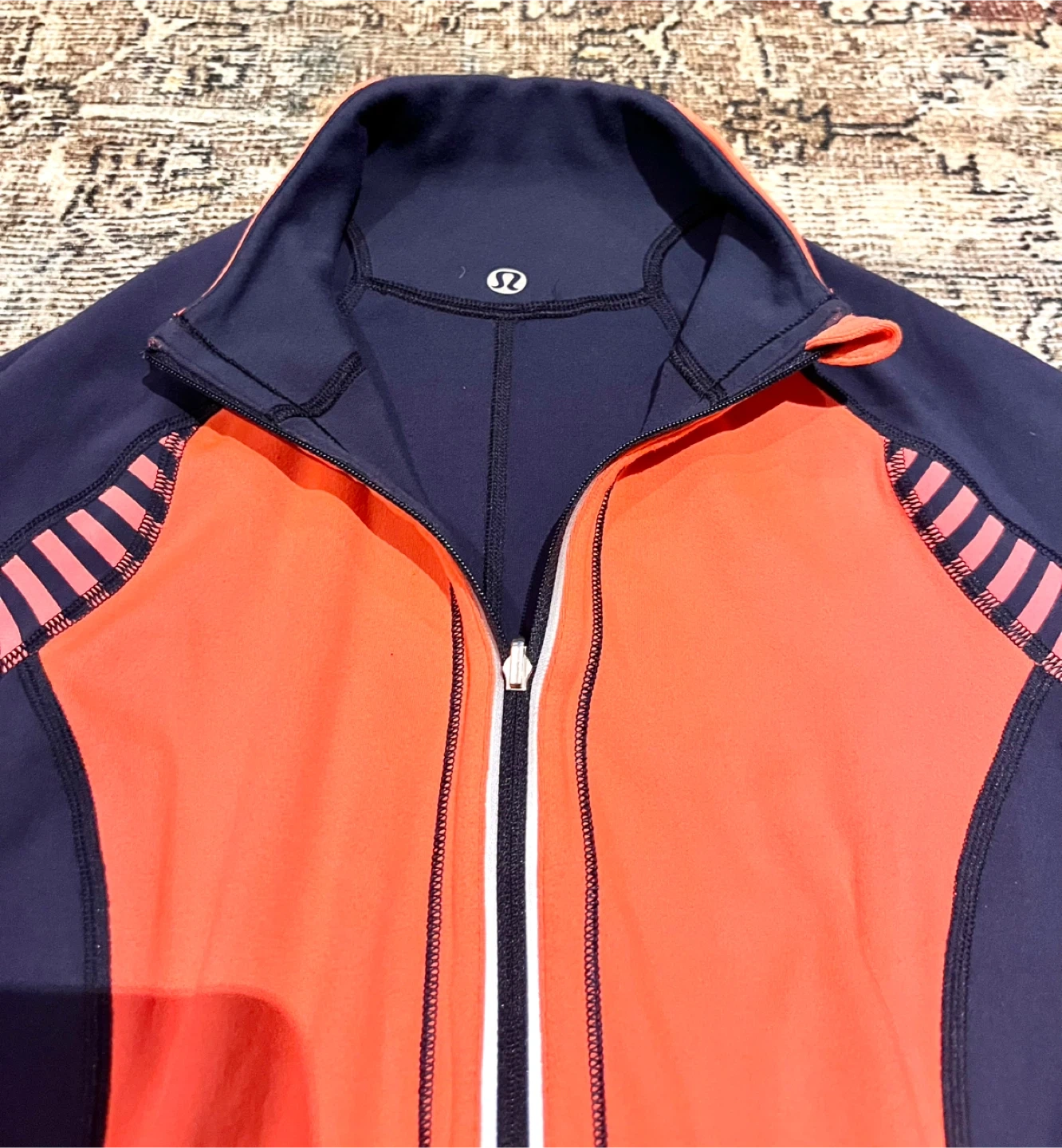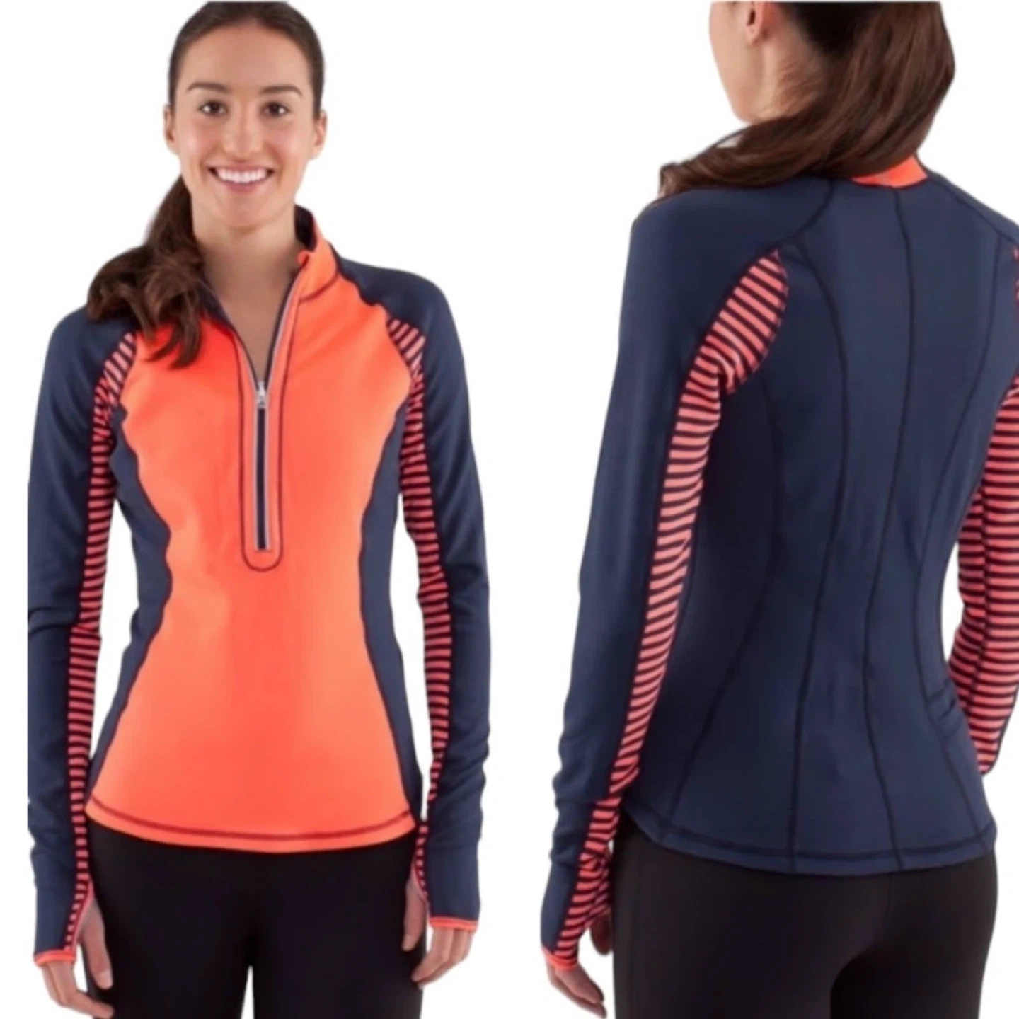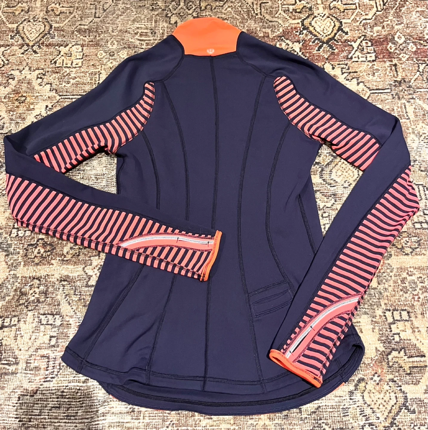 Lulu🍋 U-Turn Reversible 1/2 zip pullover. I cannot find the size but it’s too snug on me so I’d say 4. Possibly a very slim 6. Colours are navy blue and a bright coral. Reversed to mostly navy. Meant to be a warm base layer for chilly outdoor activity. Made of Luon/Rulu. Buttery soft feel. Reflective details. Discreet back pocket for a key and a card. Thumbholes to keep your sleeves down. Contoured hemline is cut higher on the sides. In EEUC.
