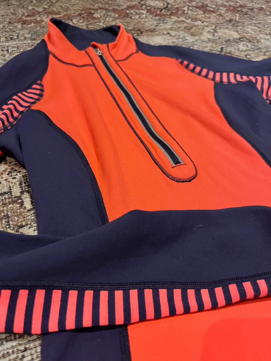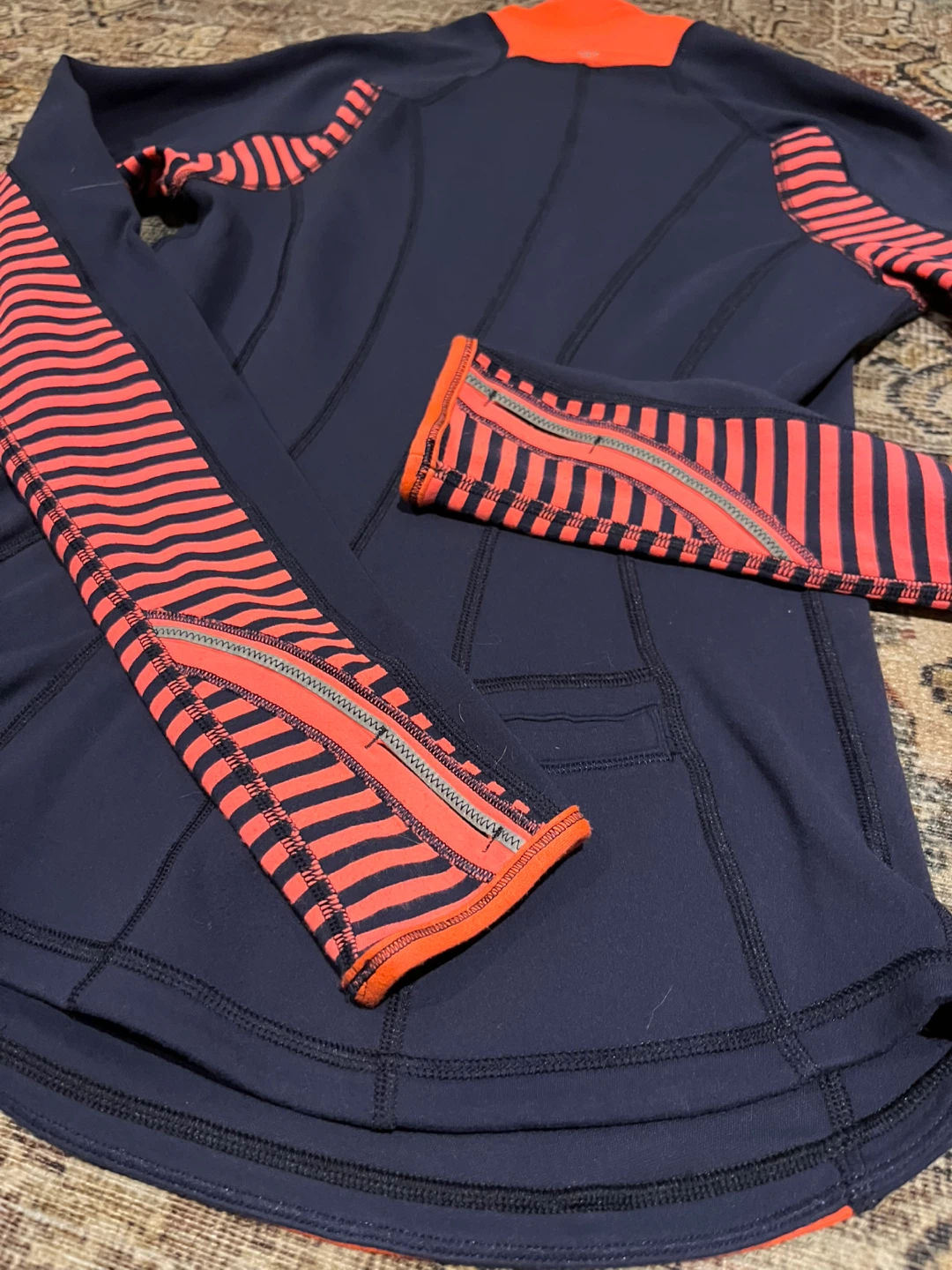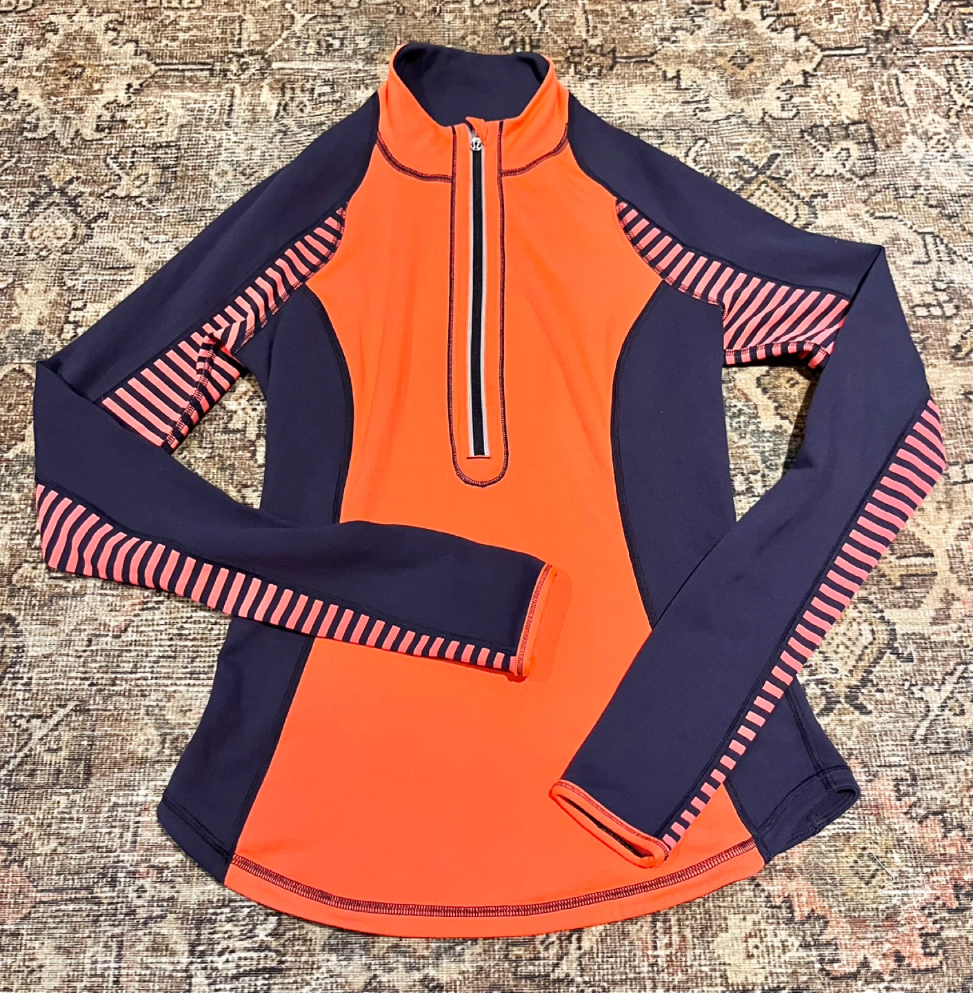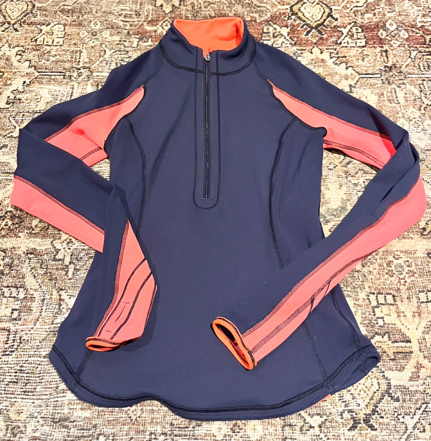 Lulu🍋 U-Turn Reversible 1/2 zip pullover. I cannot find the size but it’s too snug on me so I’d say 4. Possibly a very slim 6. Colours are navy blue and a bright coral. Reversed to mostly navy. Meant to be a warm base layer for chilly outdoor activity. Made of Luon/Rulu. Buttery soft feel. Reflective details. Discreet back pocket for a key and a card. Thumbholes to keep your sleeves down. Contoured hemline is cut higher on the sides. In EEUC.