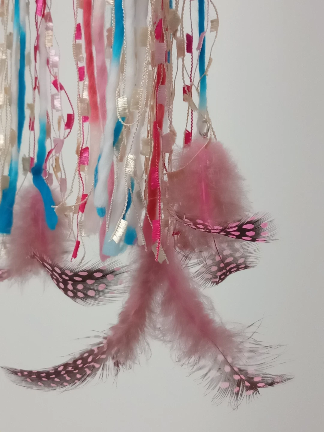 Add a touch of whimsy to your space with this lovely dream catcher! It features a mix of pink and blue colours with fluffy feathers, perfect for adding a soft and dreamy vibe to any room