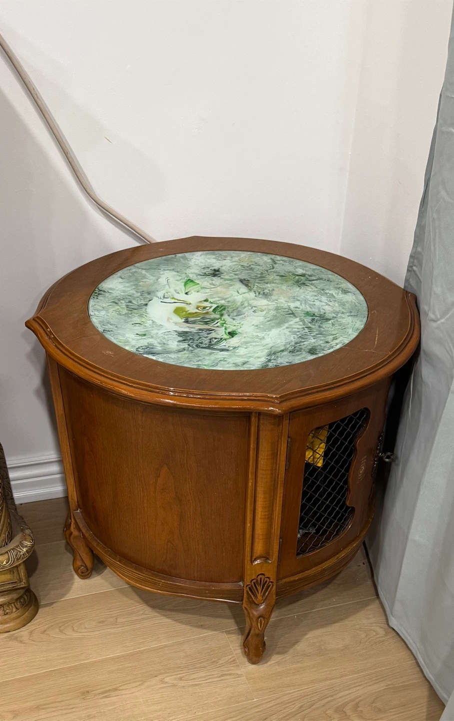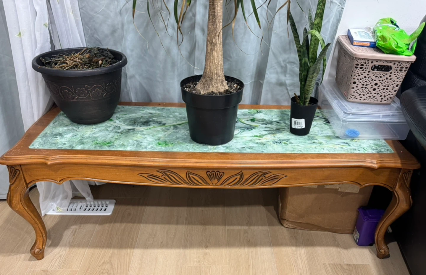 A charming vintage coffee table and 2 side tables with a carved wooden base and a distinctive green marble-patterned top. It features elegant cabriole legs and decorative carvings on the apron. This piece adds a touch of classic style to any room.