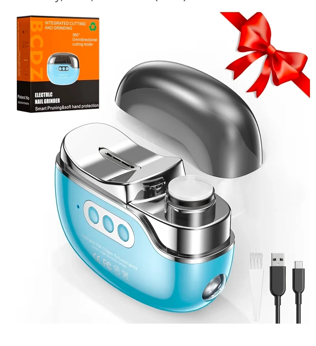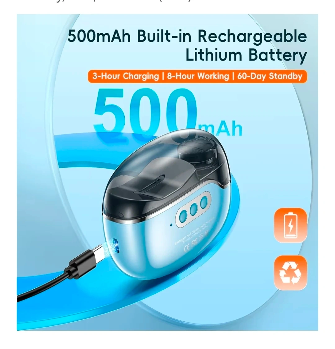 This electric nail grinder is designed for smart pruning and soft hand protection. It features integrated cutting and grinding with a 360° omnidirectional cutting mode. It has a 500mAh built-in rechargeable lithium battery offering 8 hours of working time. Includes a Type-C charging port.