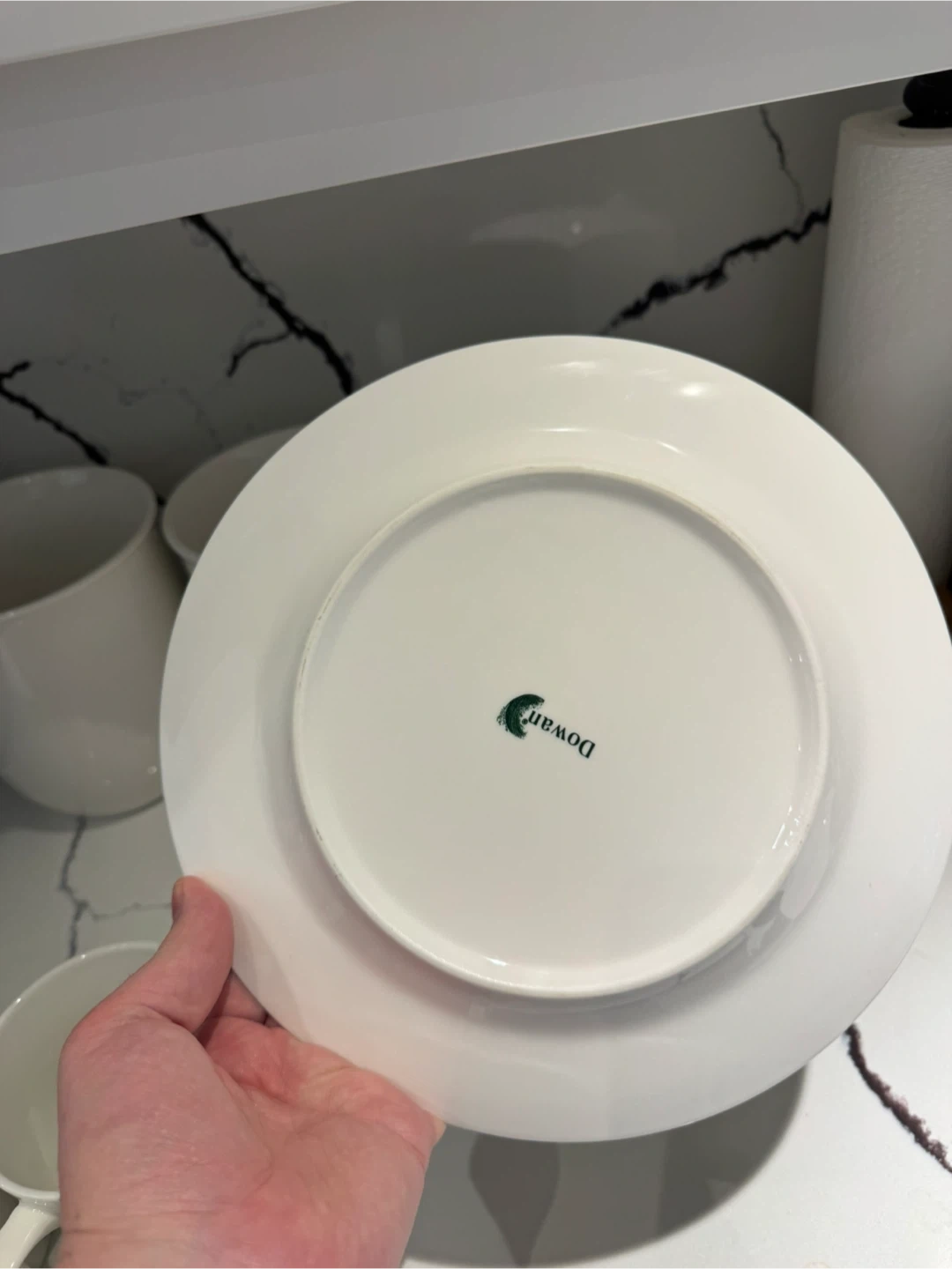 20 piece White plate featuring an orange sun and line-art leaf design. It's made of durable ceramic. Perfect for everyday meals! Lightly used