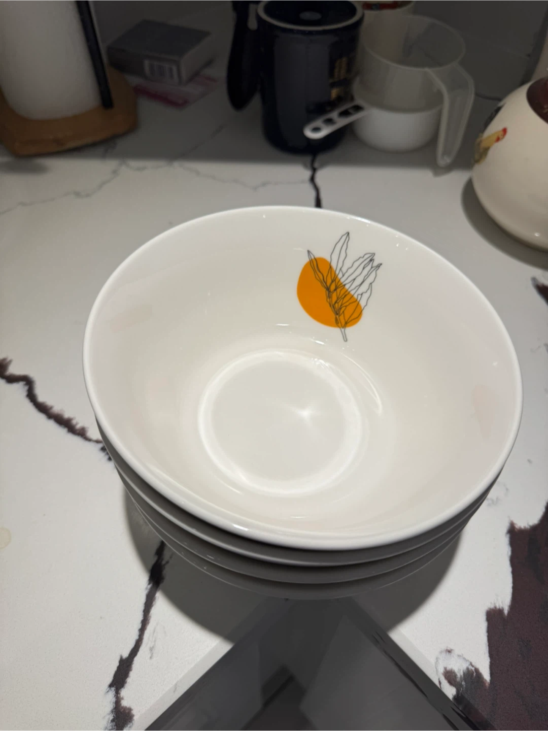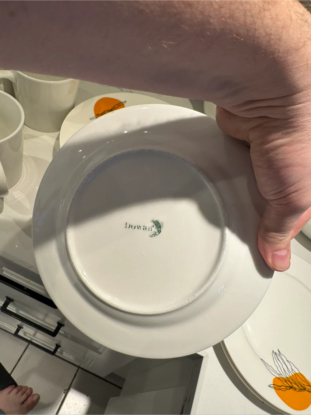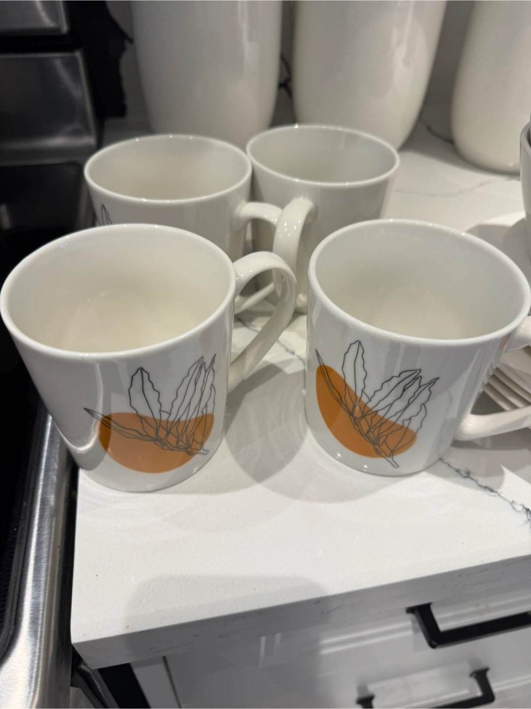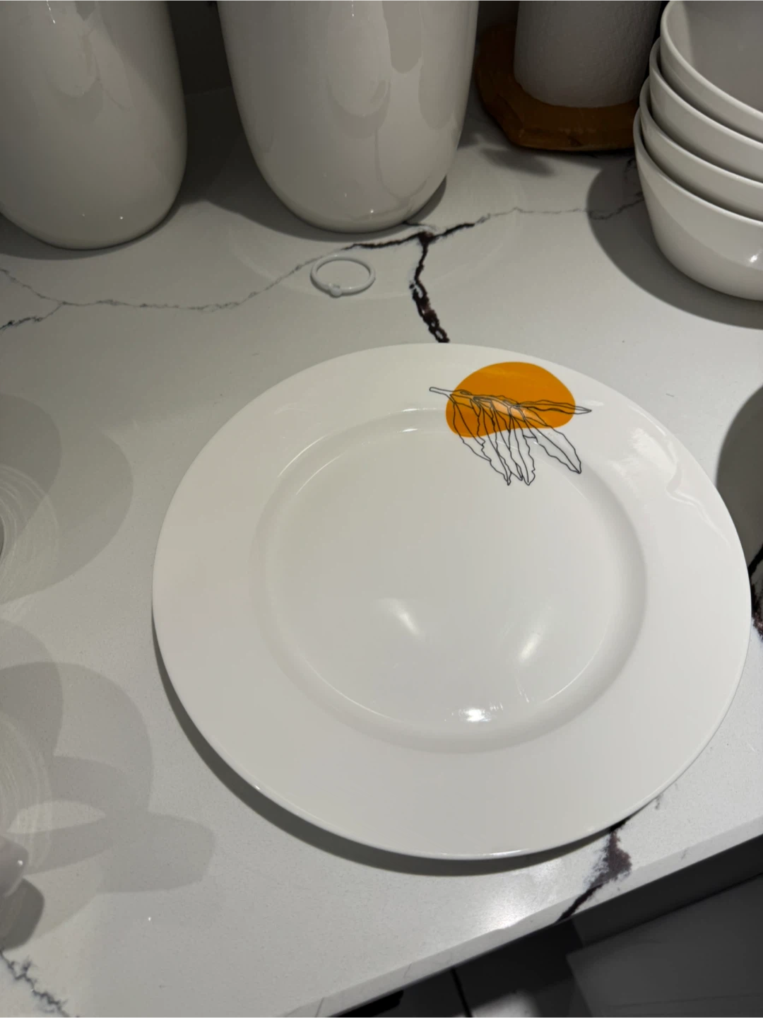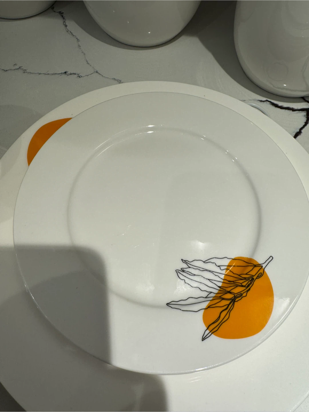 20 piece White plate featuring an orange sun and line-art leaf design. It's made of durable ceramic. Perfect for everyday meals! Lightly used