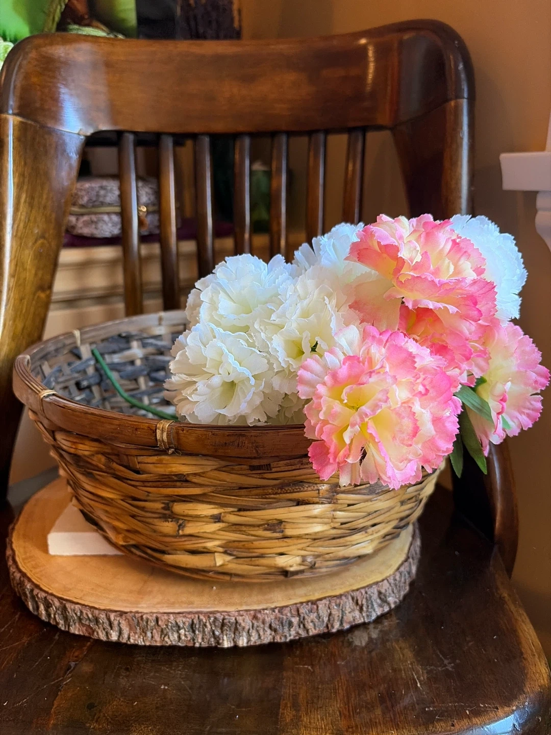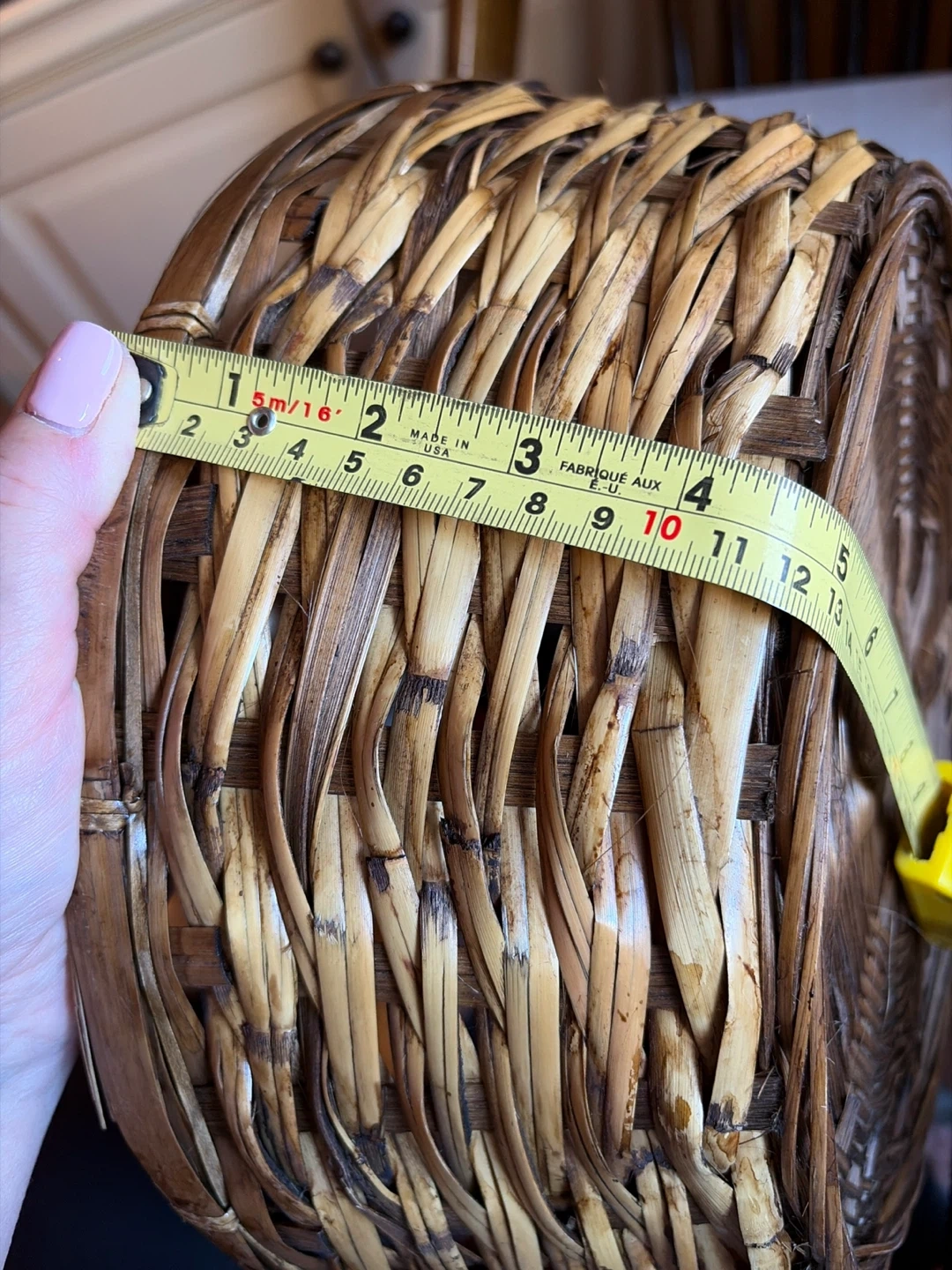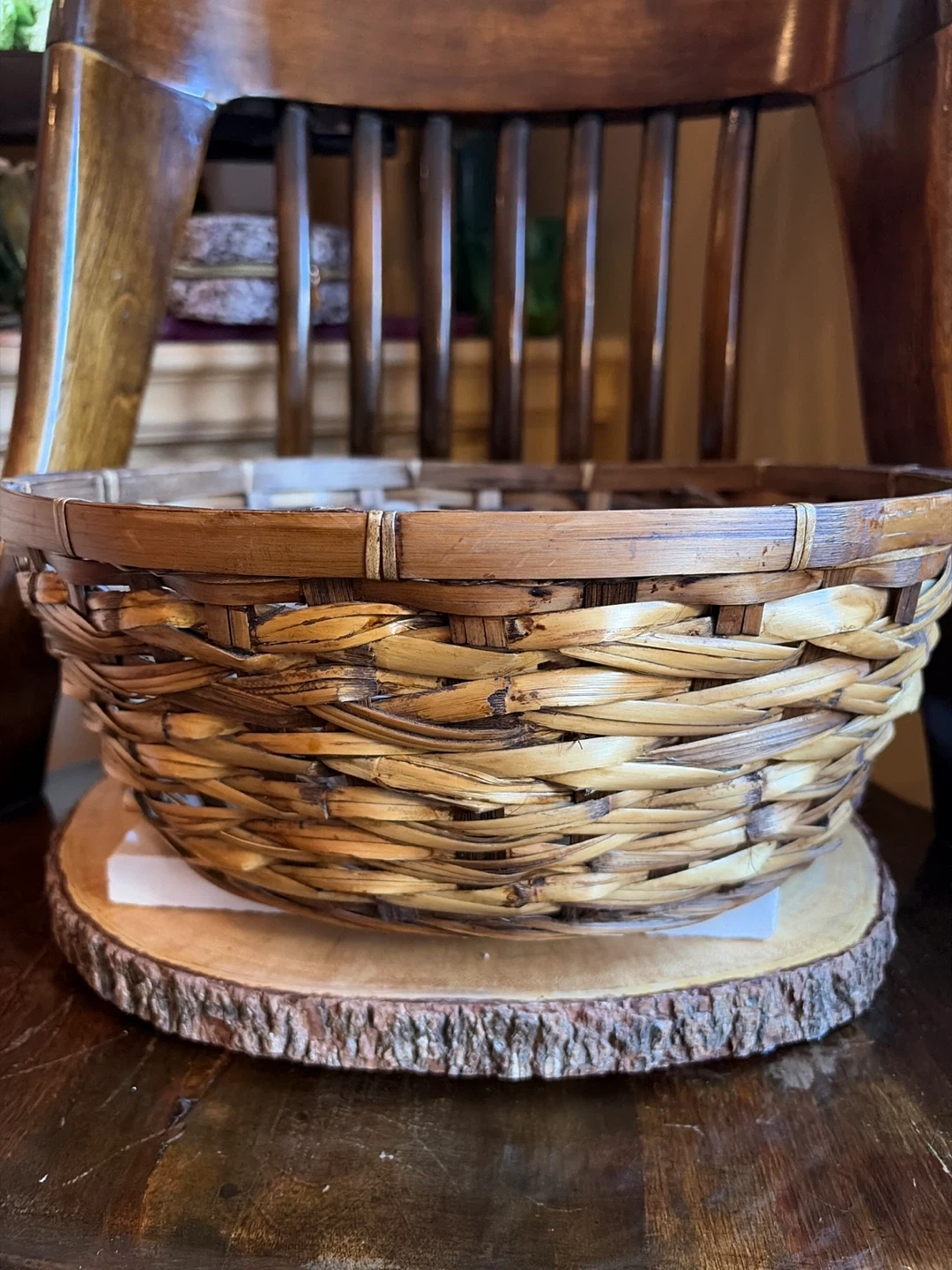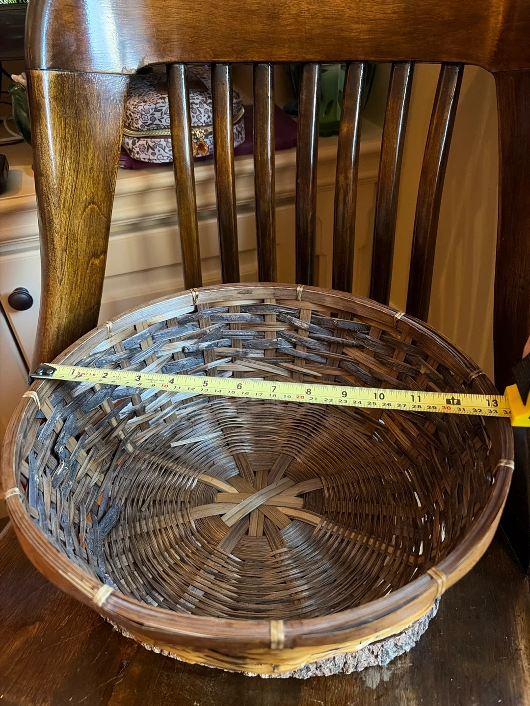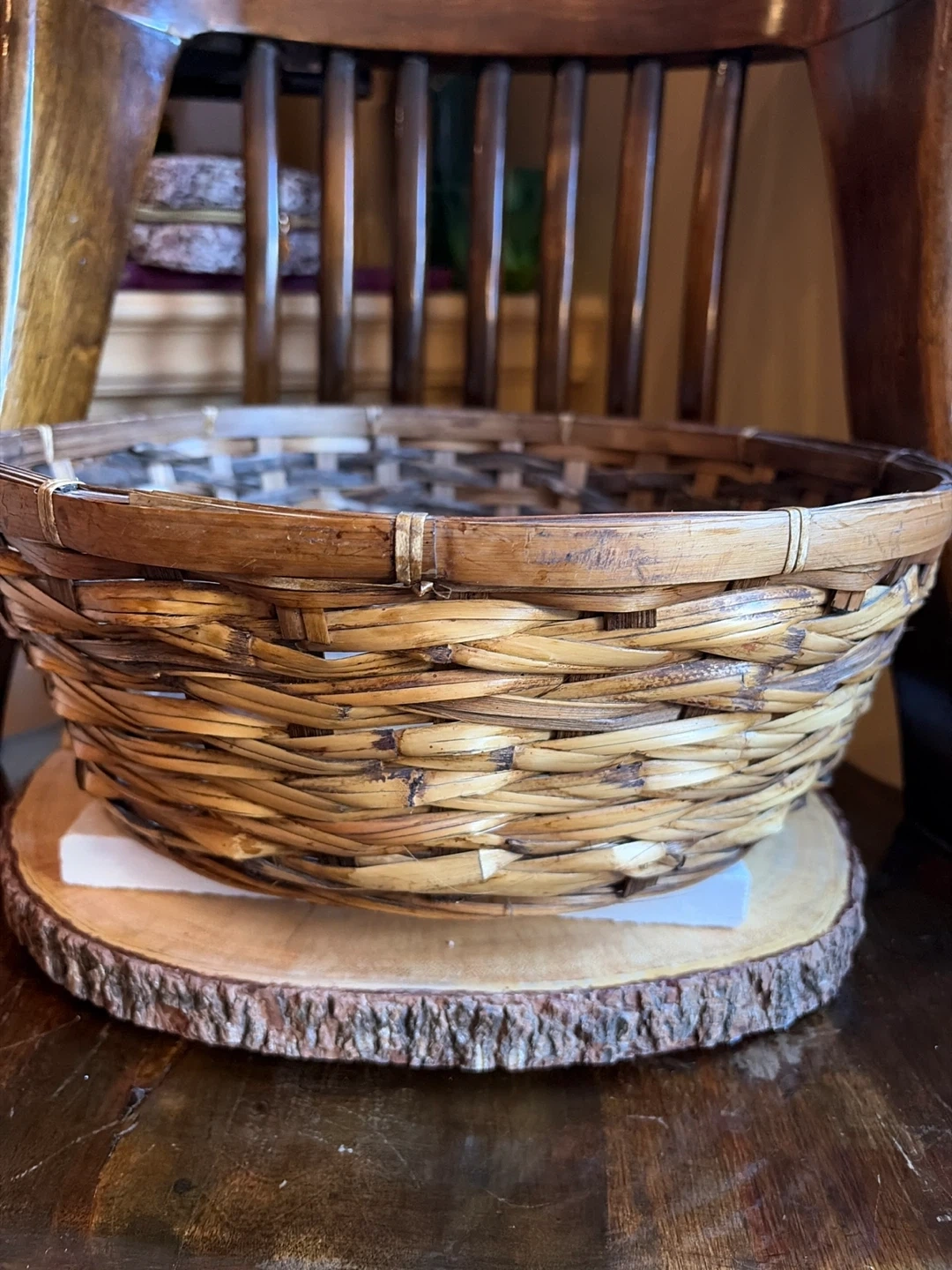 Hand-woven round basket made from wicker and maybe bamboo. Very nice details with different tones of brown within the basket. It's a versatile piece for storage or decor. Dimensions are approximately 13 inches in diameter and 5 inches high. Adds beautiful texture to a room or a shelf.