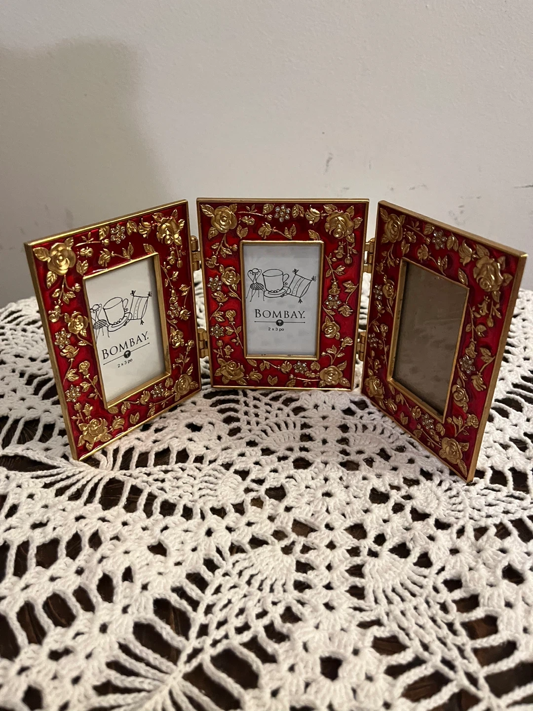 This is a Bombay tri-fold photo frame with a red and gold floral design. Each frame is 2x3 inches. It's perfect for displaying multiple cherished memories!