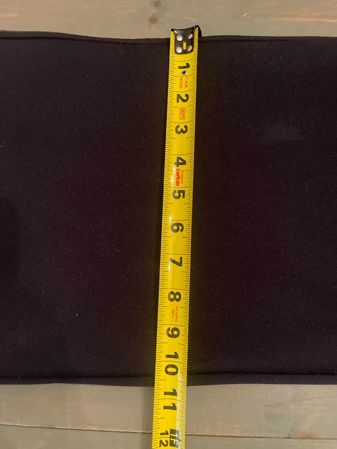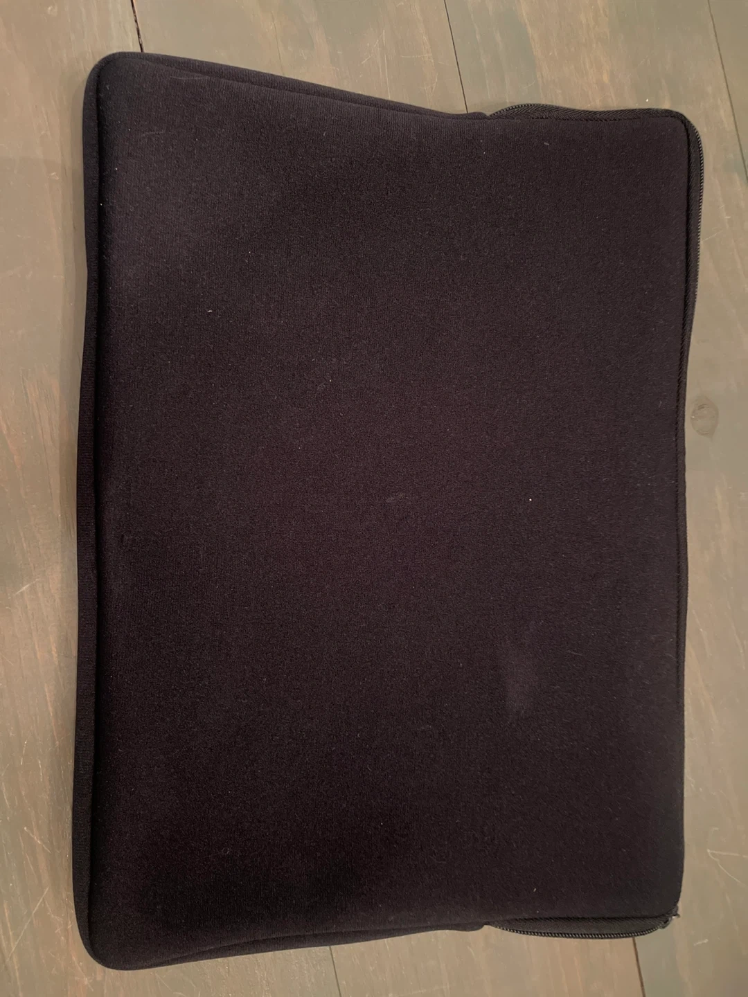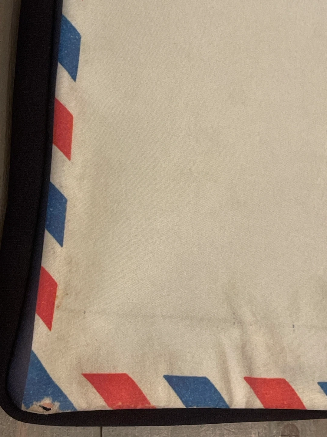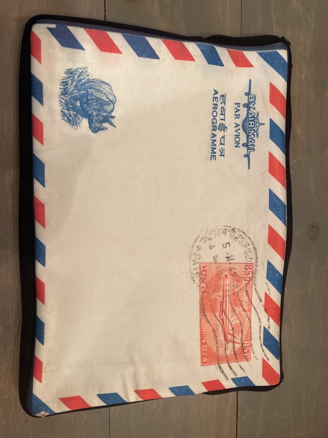 Laptop sleeve with a fun airmail design on one side and plain black on the other. It measures approximately 13 inches in length and 10 inches in height. There are some signs of wear, as shown in the photos.