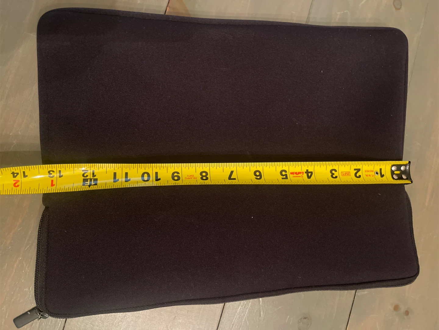 Laptop sleeve with a fun airmail design on one side and plain black on the other. It measures approximately 13 inches in length and 10 inches in height. There are some signs of wear, as shown in the photos.