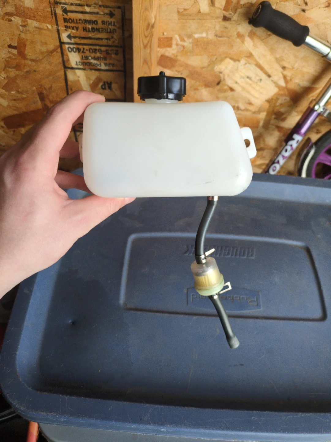 This is a mini dirt bike with a silver frame and yellow wheels. It features a small engine and suspension. Great for recreational use on appropriate terrain. Extra parts are also included. The only thing missing is a small piece that holds the throttle needle down and that's about it. Box that holds parts and cubbies included. Fairly new fuel tank also included.