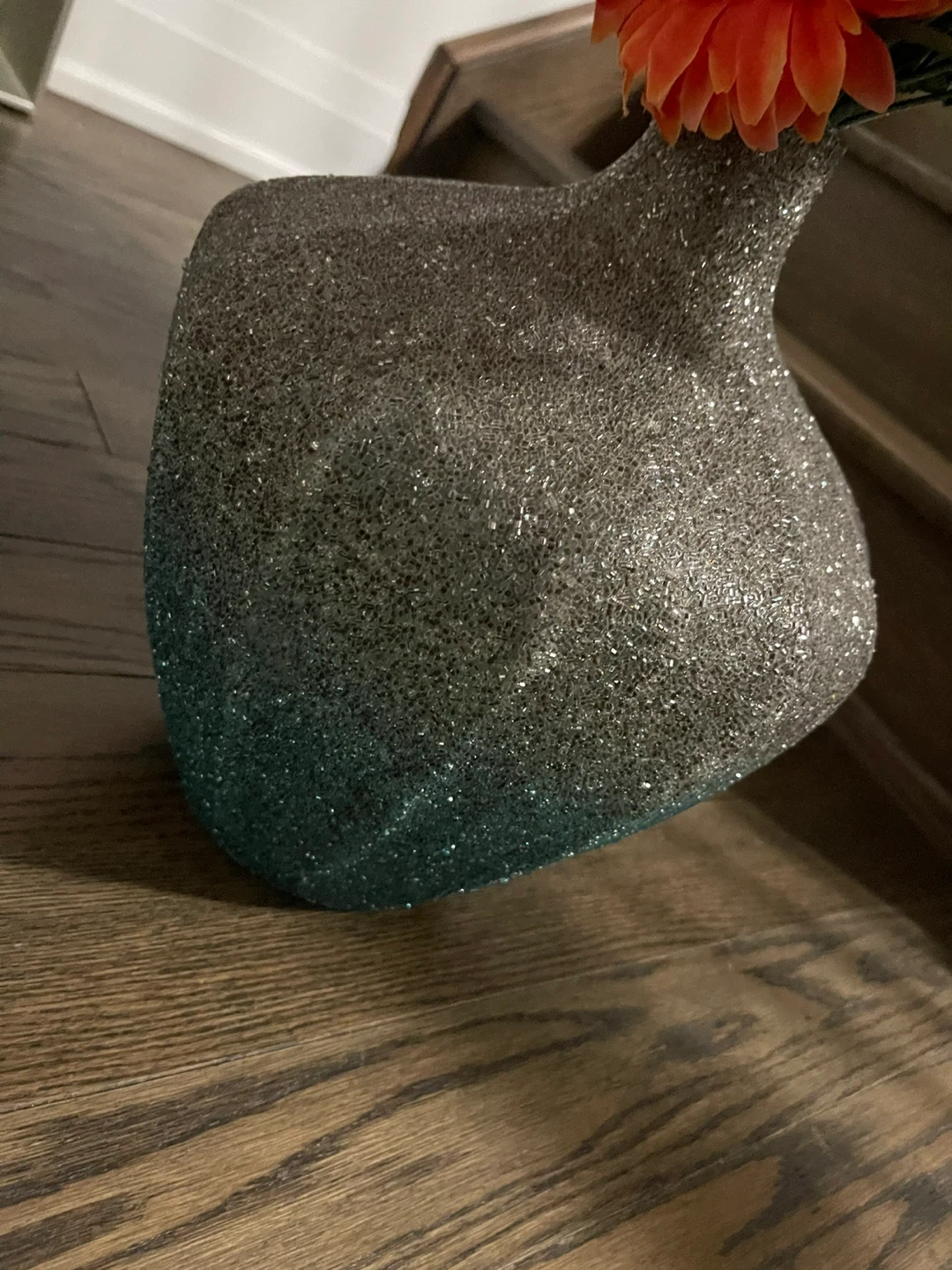 Here's a lovely decorative vase that would look great in any room! It features a gradient from silver to blue and has a textured, glittery finish. Perfect for displaying flowers or as a standalone piece