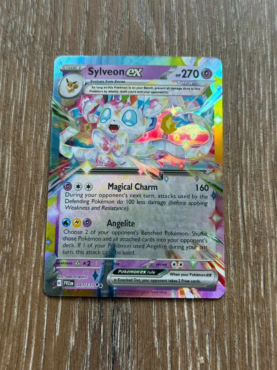 Selling a Sylveon EX holographic trading card from Pokemon. It's from the "Primal Clash" set and features the "Magical Charm" attack. Other Pokemon cards are also available.
