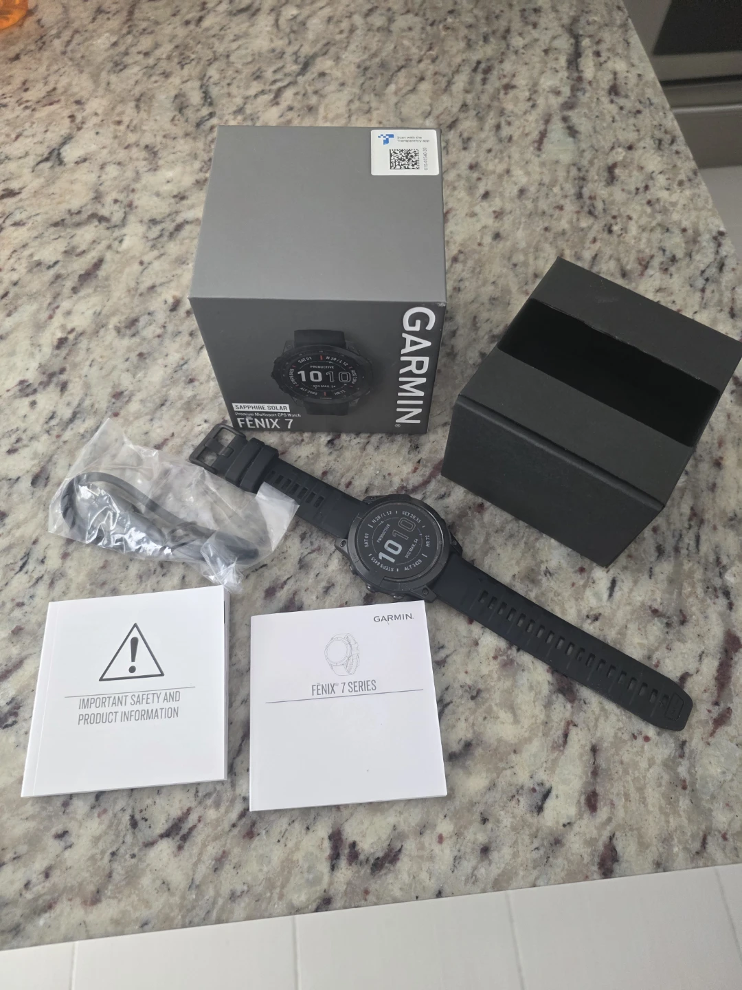 This is a Garmin Fenix 7 Series Sapphire Solar smartwatch. It comes with the original box, charging cable, and product information pamphlets. This rugged smartwatch is built for adventure and provides advanced fitness tracking and navigation features.