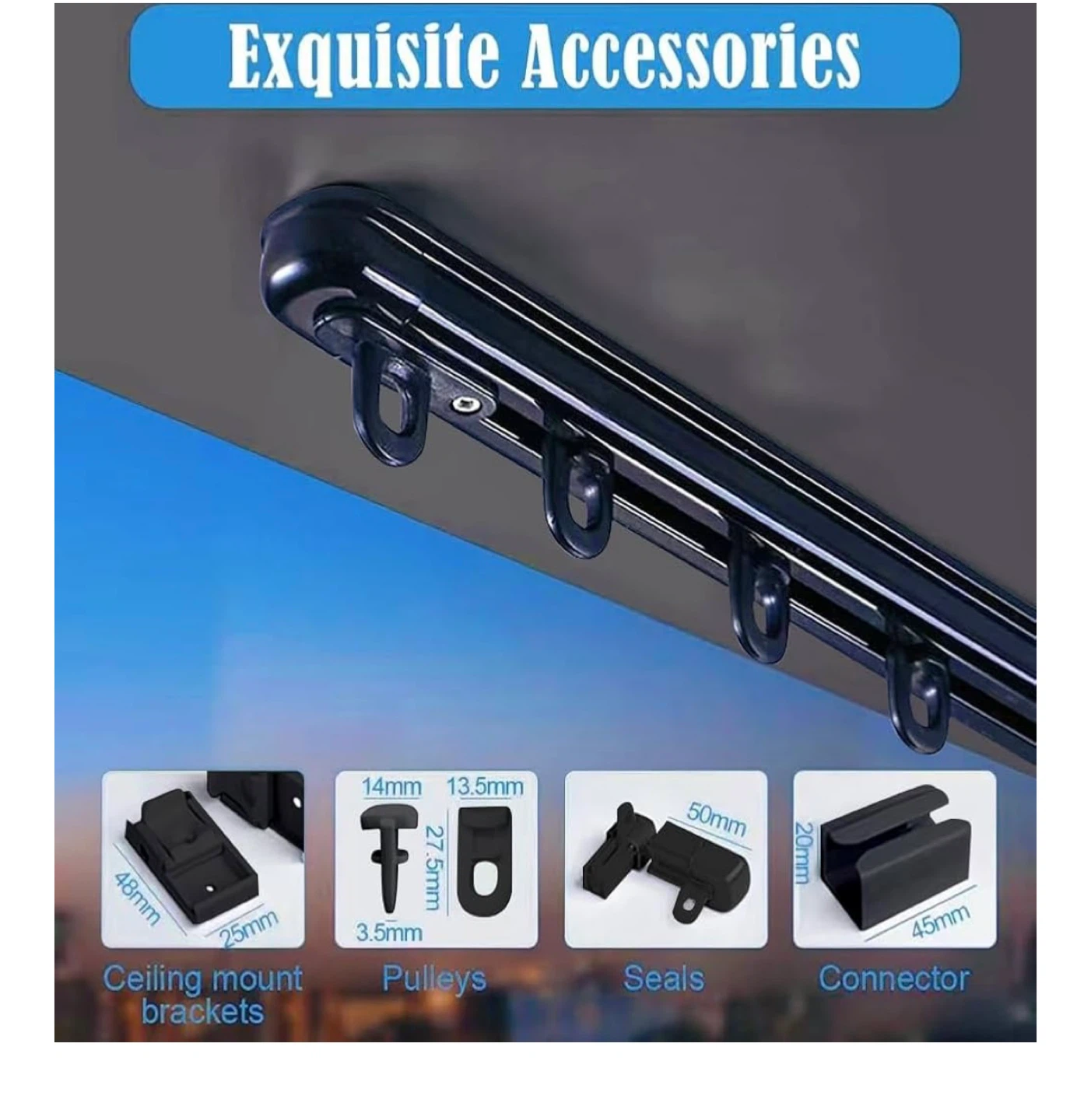 Selling a curtain track with exquisite accessories! It includes ceiling mount brackets, pulleys, seals, and a connector. Perfect for hanging your curtains with ease and style
