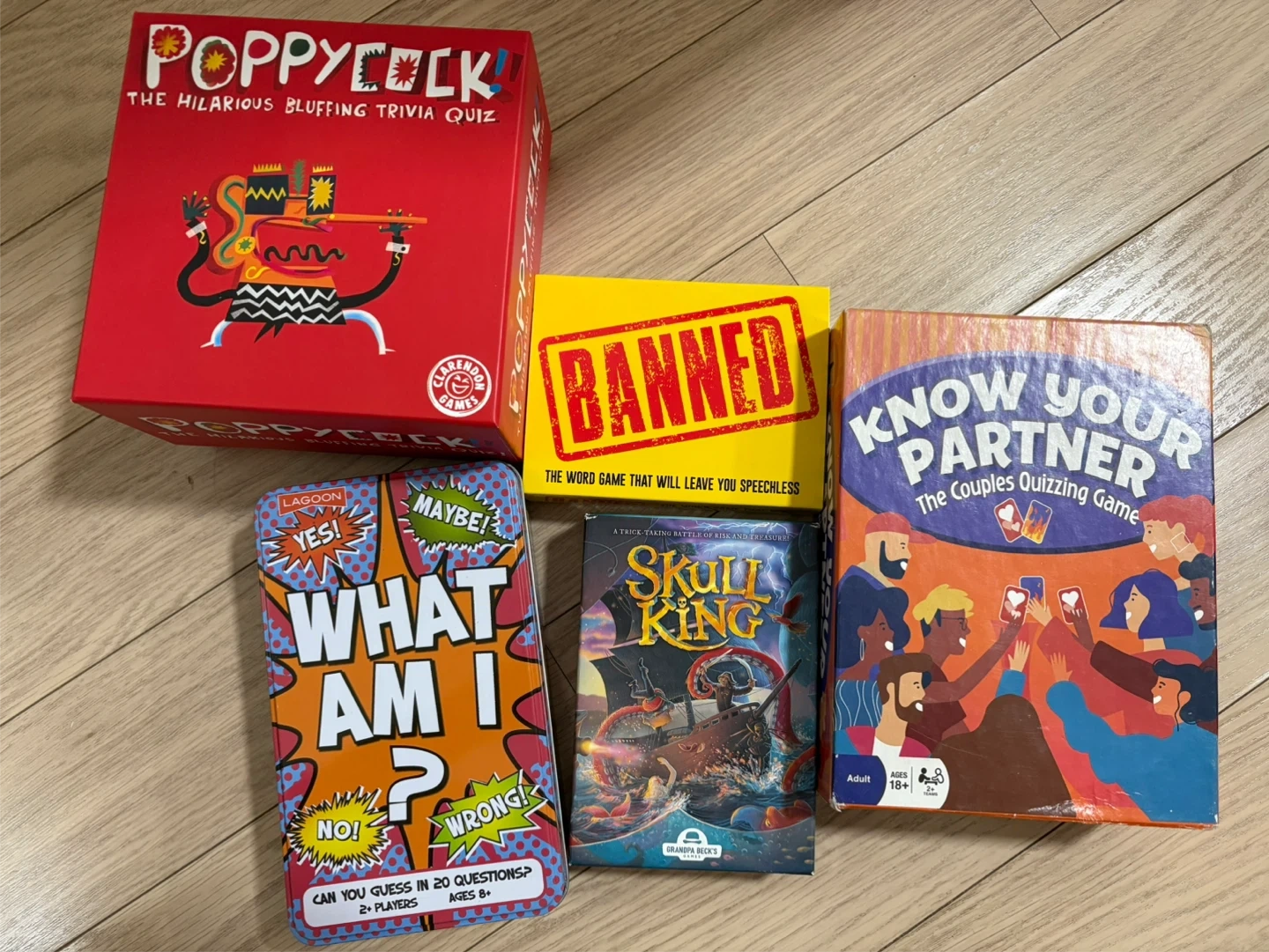 Five board games for your next get-together. Includes Poppycock, Banned, What Am I?, and Know Your Partner. Suitable for adults and families. Great for game nights!