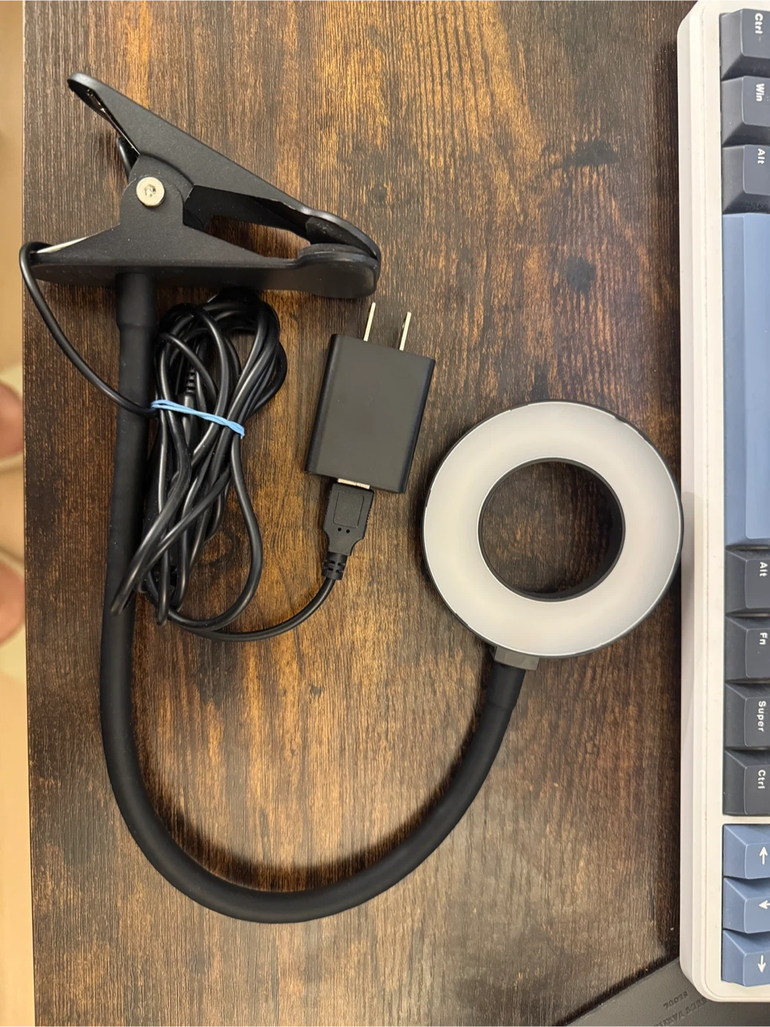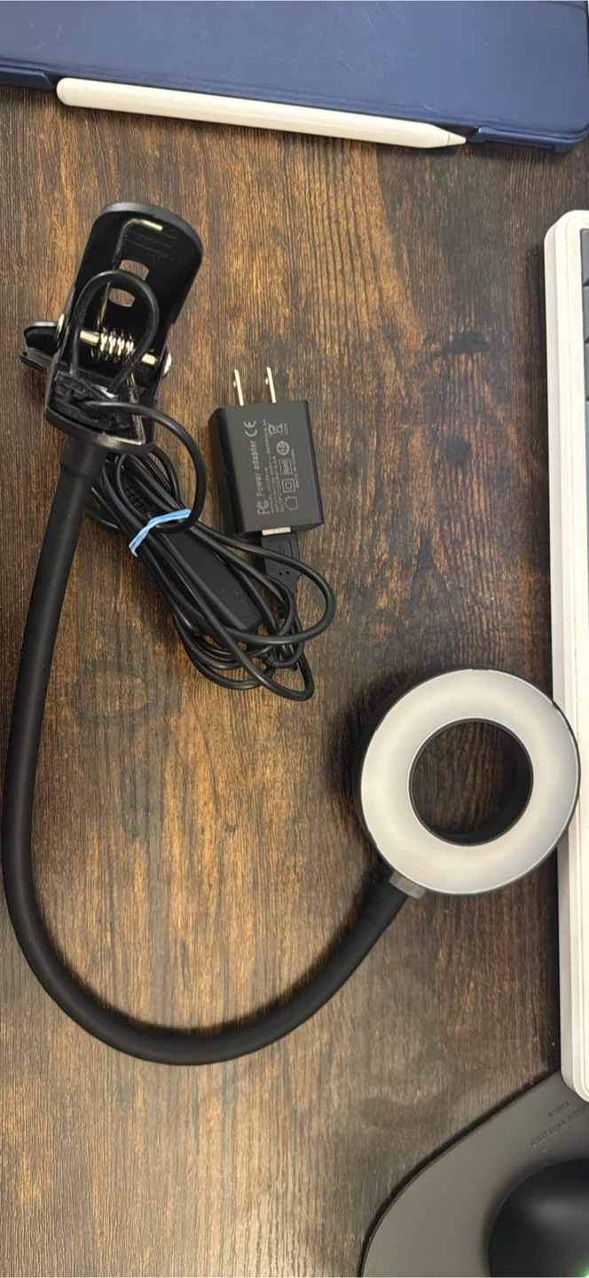 This is a clip-on ring light with a flexible gooseneck and a USB power adapter. The clip allows for easy attachment to desks or shelves. It's great for video calls or content creation!