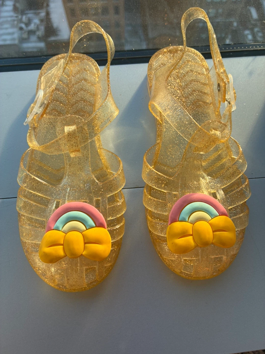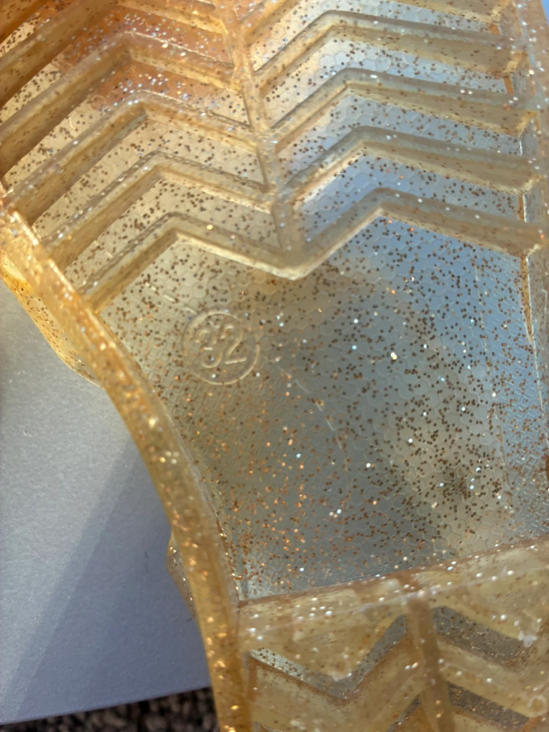 These adorable rainbow jelly sandals are perfect for your little one! They are a size EU 32 approximately US 13.5/1 and feature a cute rainbow design on the front.