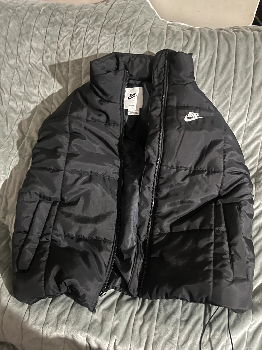 This is a black Nike puffer vest. It's a sleeveless jacket with a full zip closure. Made with synthetic fill for warmth. Excellent for layering!