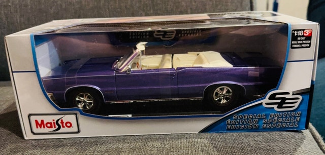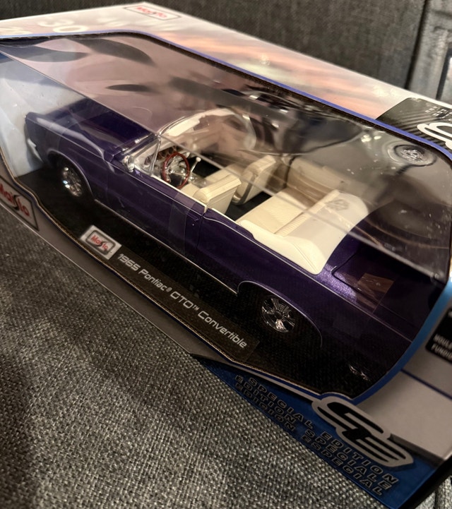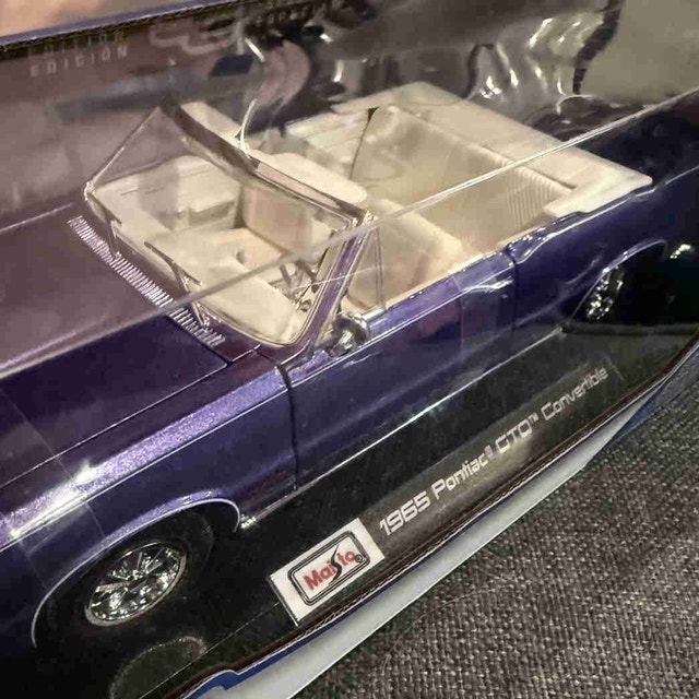 I'm selling a Maisto 1:18 scale model of the 1965 Pontiac GTO Convertible, a true classic car replica. The model showcases a detailed interior, a beautiful purple exterior finish, and is in excellent condition, still in its original packaging. Features include: 1:18 scale diecast model, 1965 Pontiac GTO Convertible, and a detailed interior and exterior. Grab this rare collectible to add a touch of vintage class to your collection!