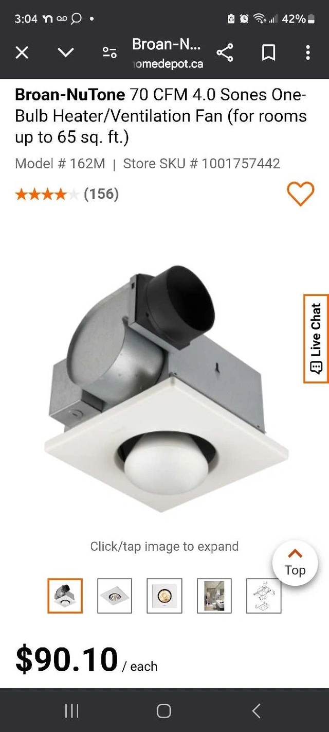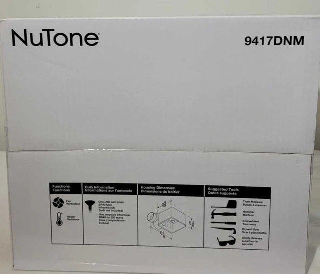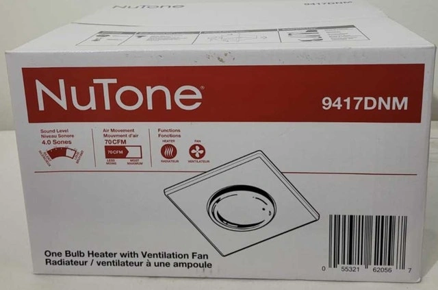 Brand new in box. Features: 70 CFM, 4.0 Audible Sones, for rooms up to 65 sq. ft.; robust steel housing and adjustable mounting brackets for easy install; Requires one 250-watt R40/BR40 infrared bulb for comfortable heat. Comparable to $90 plus tax from Home Depot.