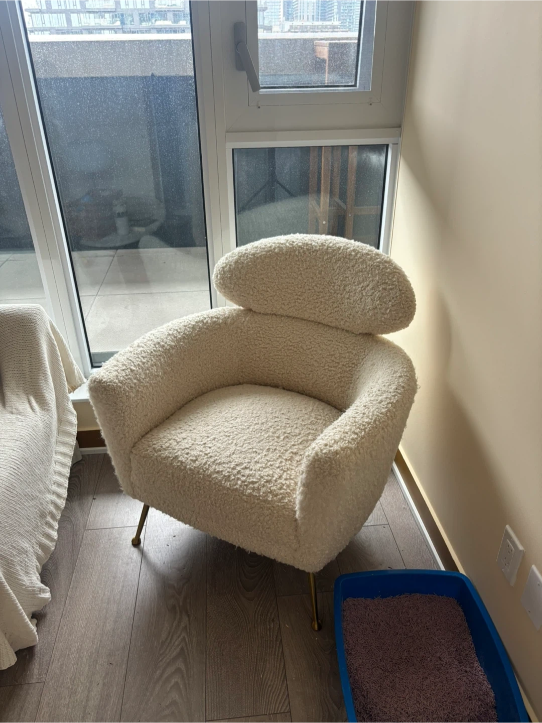 Selling a cozy cream boucle accent chair! It's in great condition and would look lovely in any living space. The chair features a soft, textured boucle fabric and a supportive back cushion. Perfect for adding a touch of warmth and style to your home