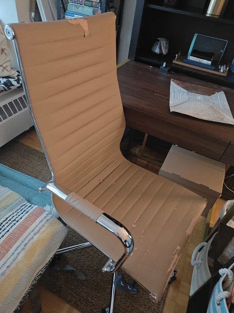 This is a tan office chair with a high back. It has a chrome base and armrests. The faux leather shows some peeling and wear, on the seat and top of the backrest.
