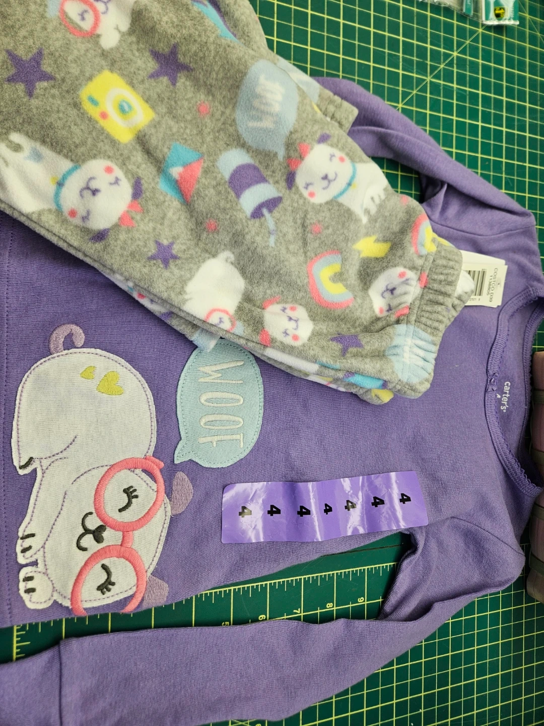 Carter's purple long sleeve shirt featuring a cute dog graphic. It comes with grey pants adorned with various playful characters. Size is 4.