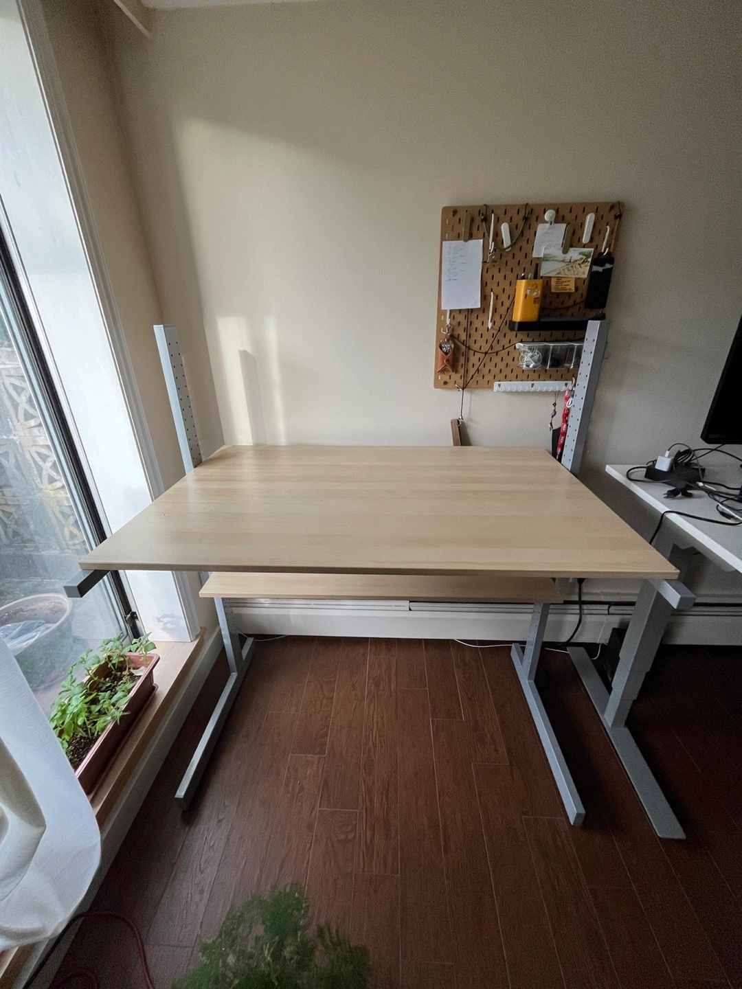 A good solid IKEA desk I got used, good for fixed standing height (I have it at 100cm high table surface) and you can unscrew to adjust. Previous owner cut the back edge in a straight line as pictured. A few cosmetic marks on surface, and <1cm dent on left surface. Metal Frame size: 127cm x 69cm x 143cm. Comes with the smaller shelf you can also position any height along the frame.