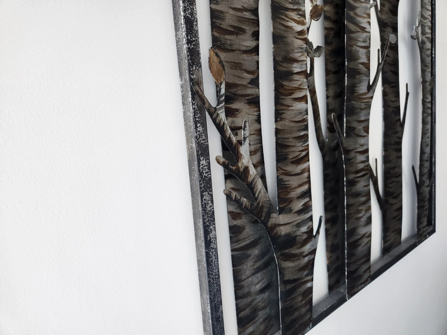 This decorative metal wall art depicts a 3F forest of birch trees with a distressed grey frame. It's a striking piece for any room. Originally from Urban Barn. Approx 23.5 x 27.5. Cash only. Non smoking home.