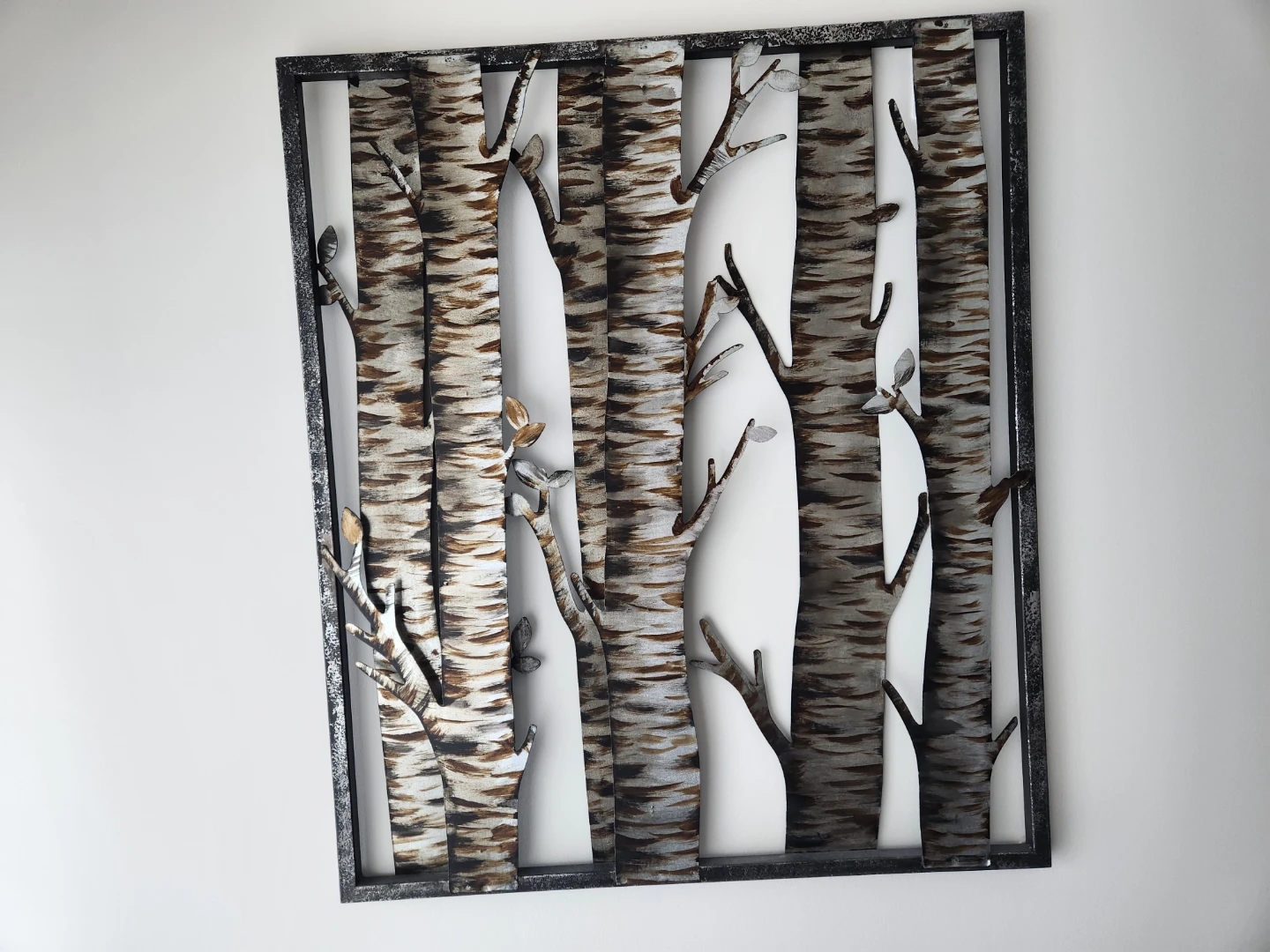 This decorative metal wall art depicts a 3F forest of birch trees with a distressed grey frame. It's a striking piece for any room. Originally from Urban Barn. Approx 23.5 x 27.5. Cash only. Non smoking home.