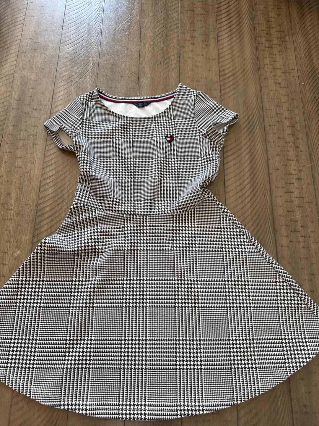 Tommy Hilfiger short-sleeve dress with a black, white, and red plaid pattern. It features a crew neck and a flared skirt. Made from a soft, comfortable fabric.