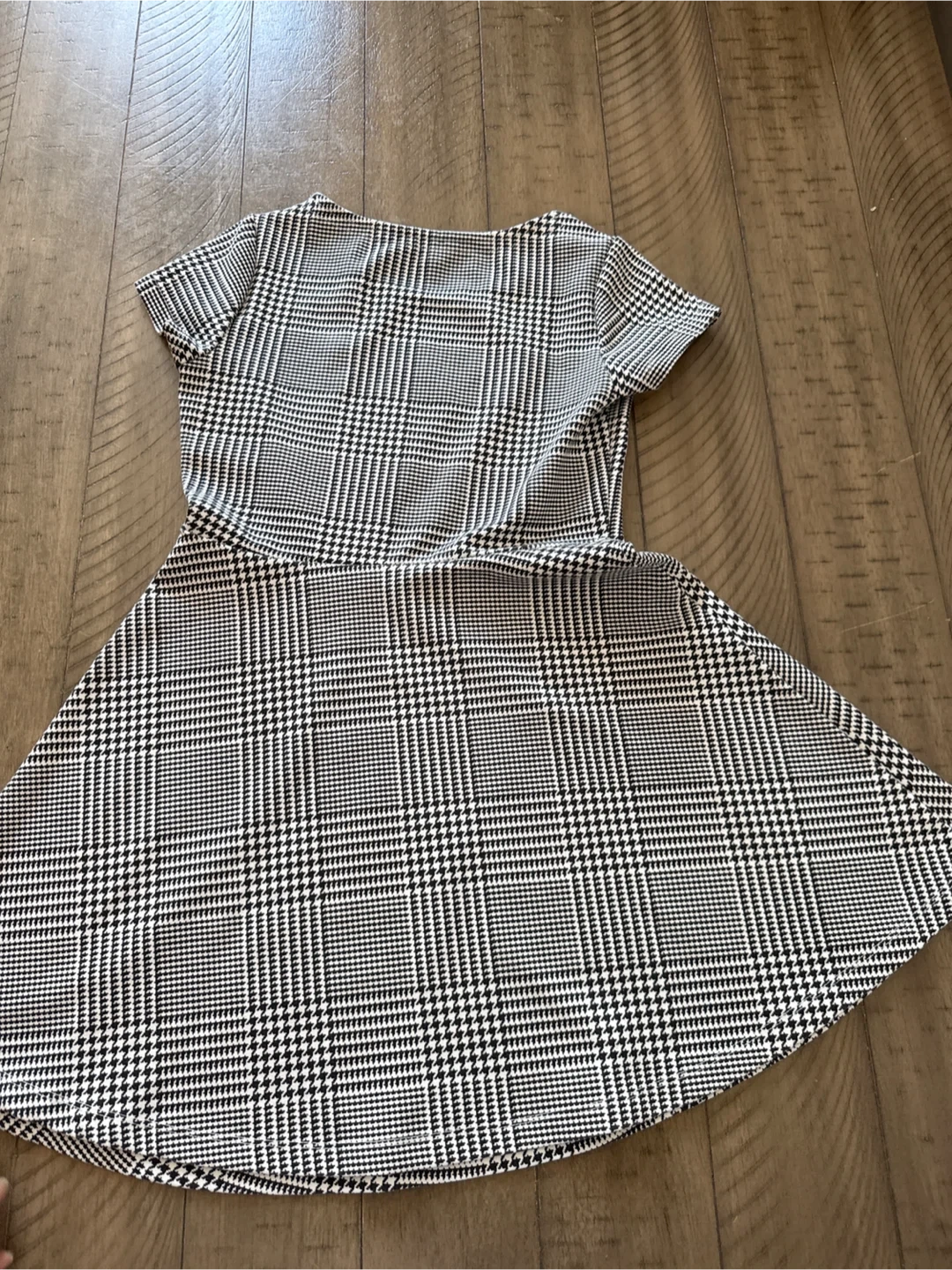 Tommy Hilfiger short-sleeve dress with a black, white, and red plaid pattern. It features a crew neck and a flared skirt. Made from a soft, comfortable fabric.