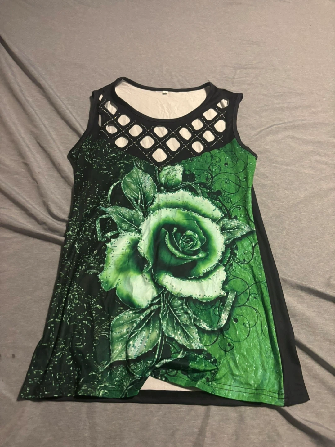 Selling a green rose print tank top in size small It features a unique cut-out design at the top. The top is new