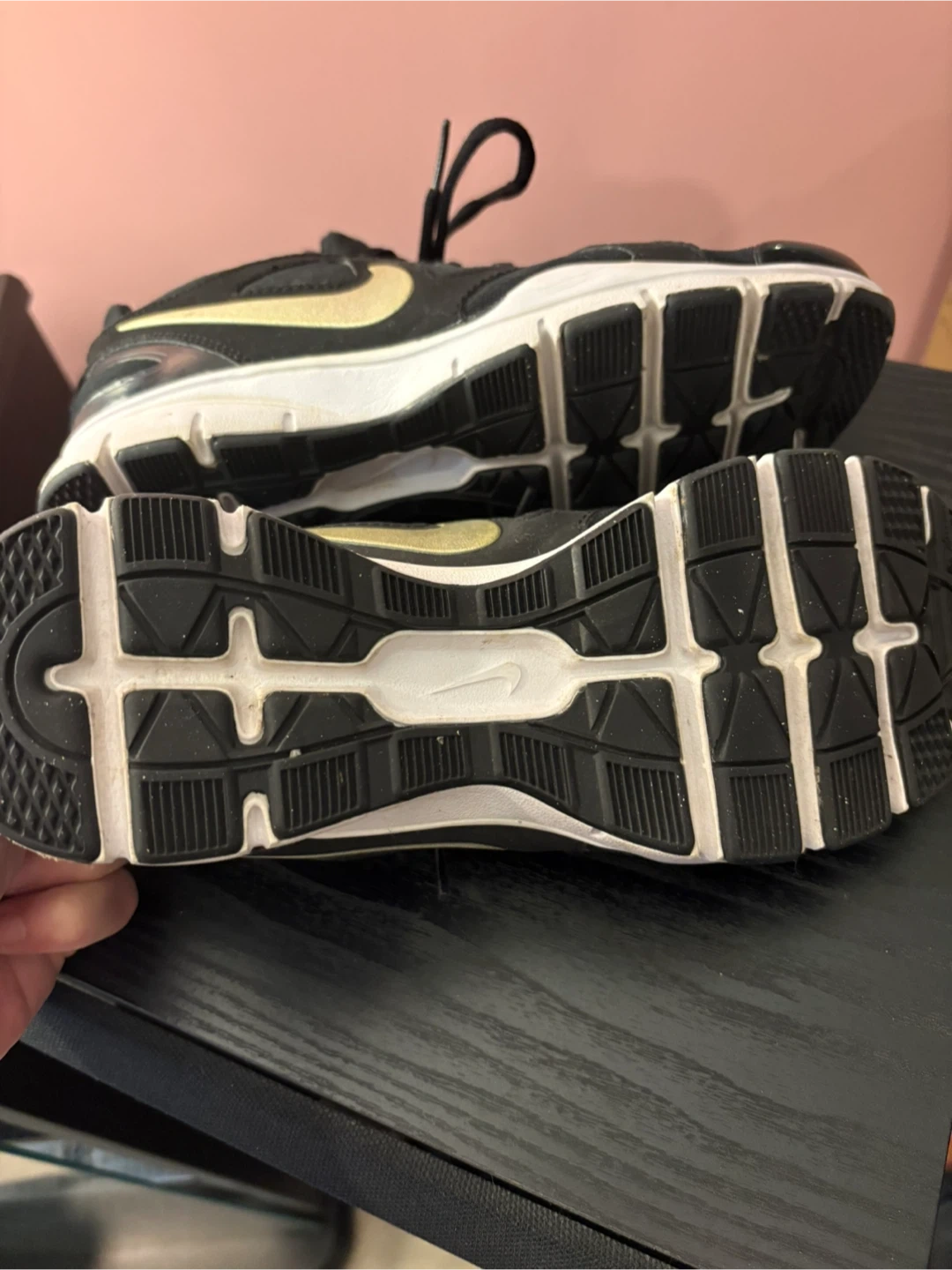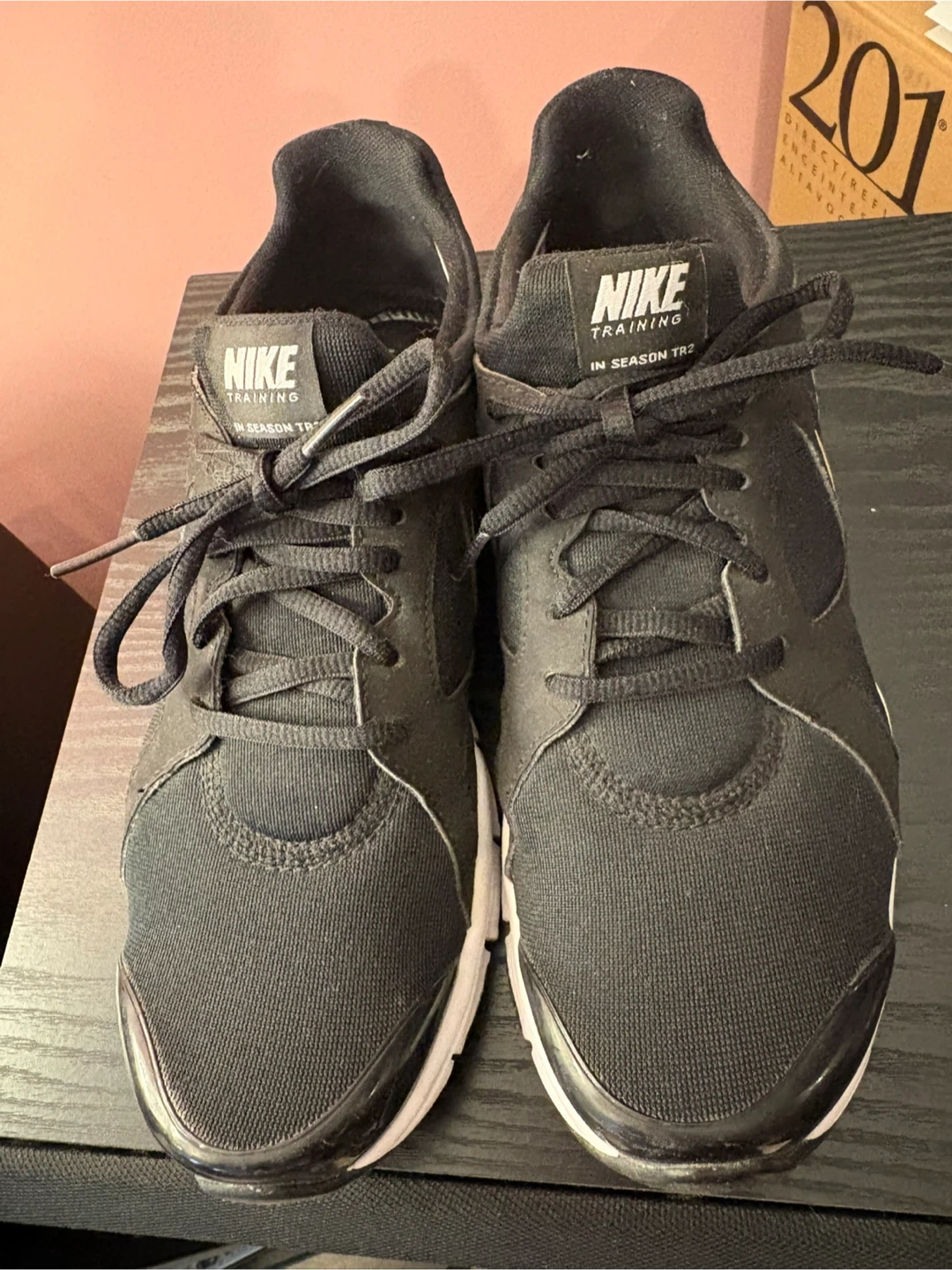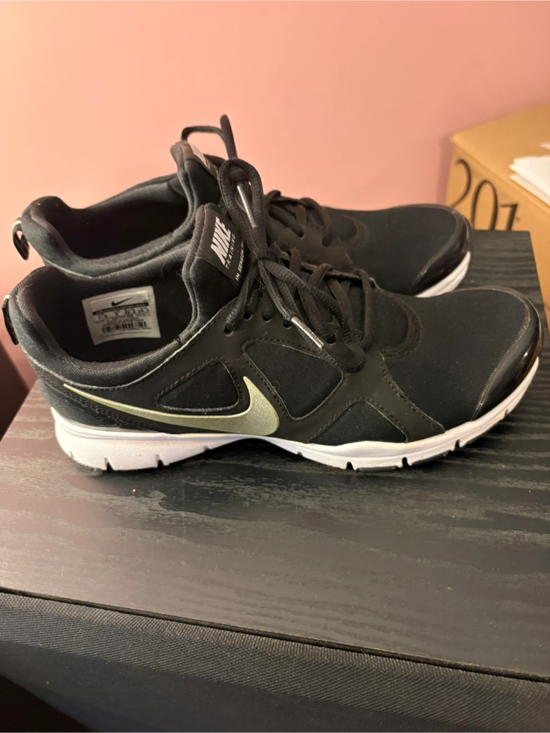 Nike In Season TR2 training shoes for women. These black and gold sneakers feature Nike Comfort Footbed for added cushioning. They're designed for comfortable workouts.