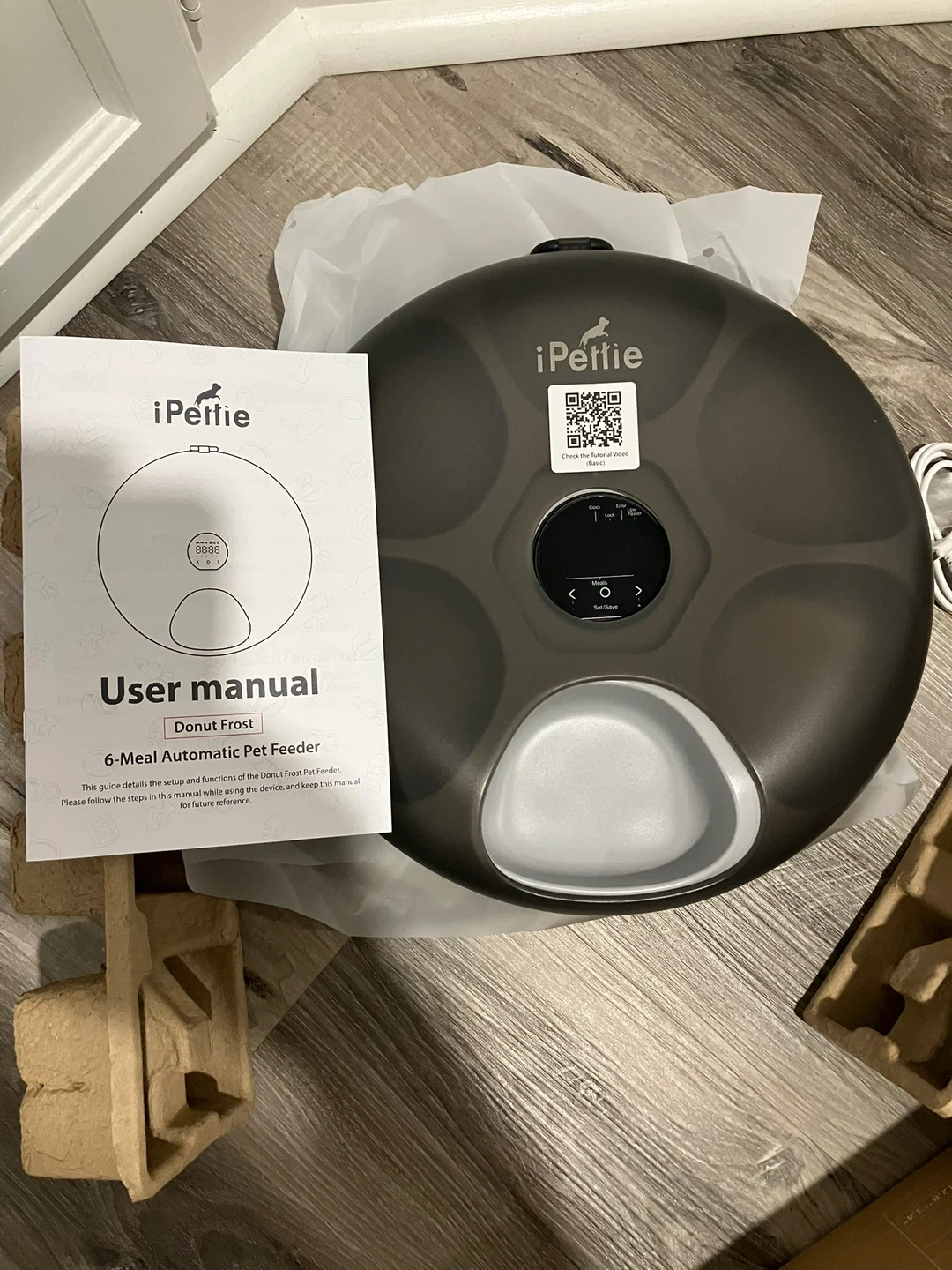 This is the iPettie Donut Frost 6-Meal Automatic Pet Feeder. It features six meal compartments for programmed feeding. This feeder is useful for pet owners who need to manage their pet's meal schedule accurately.