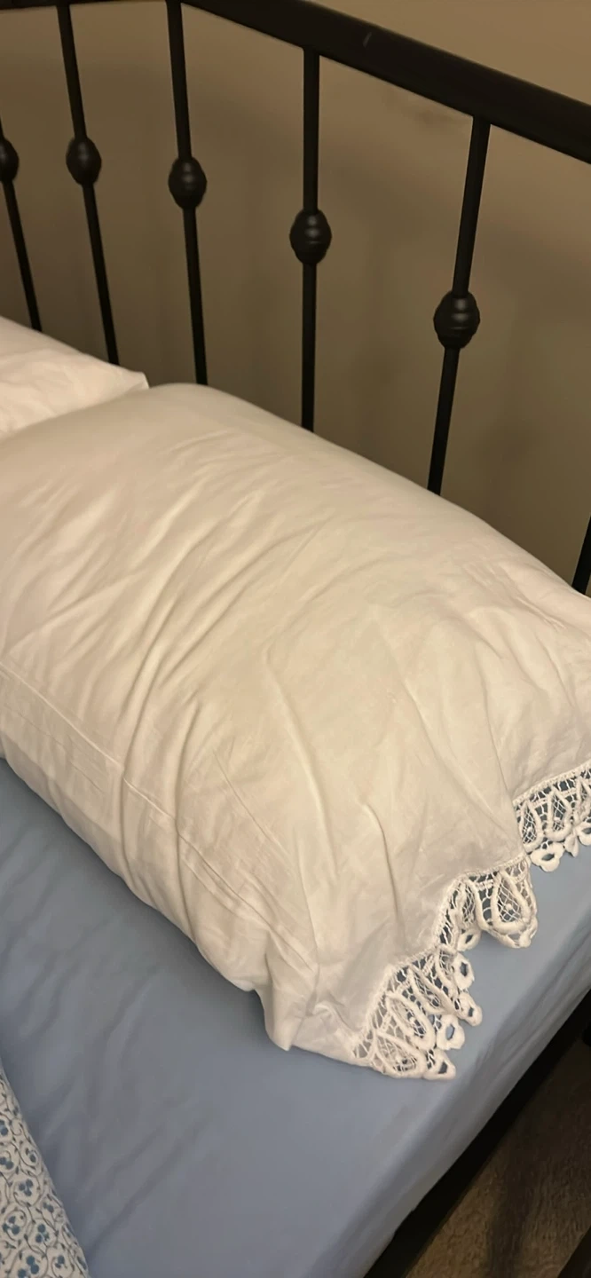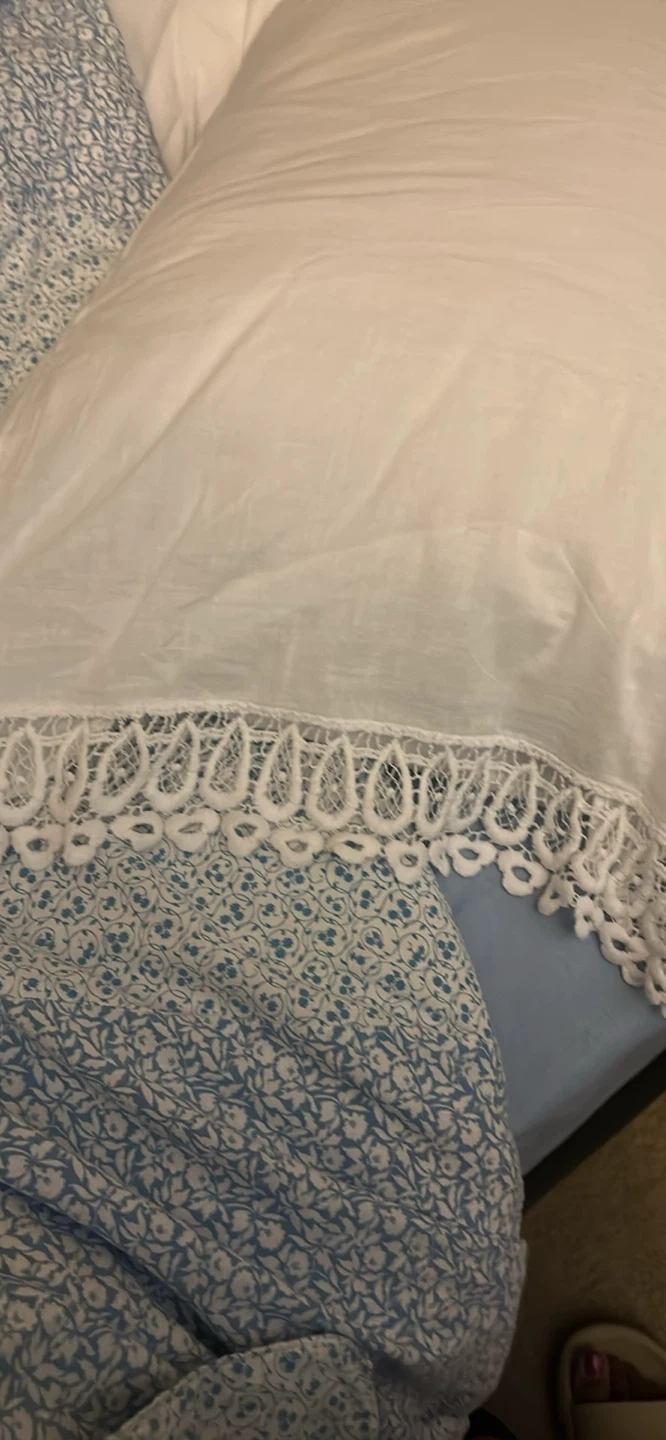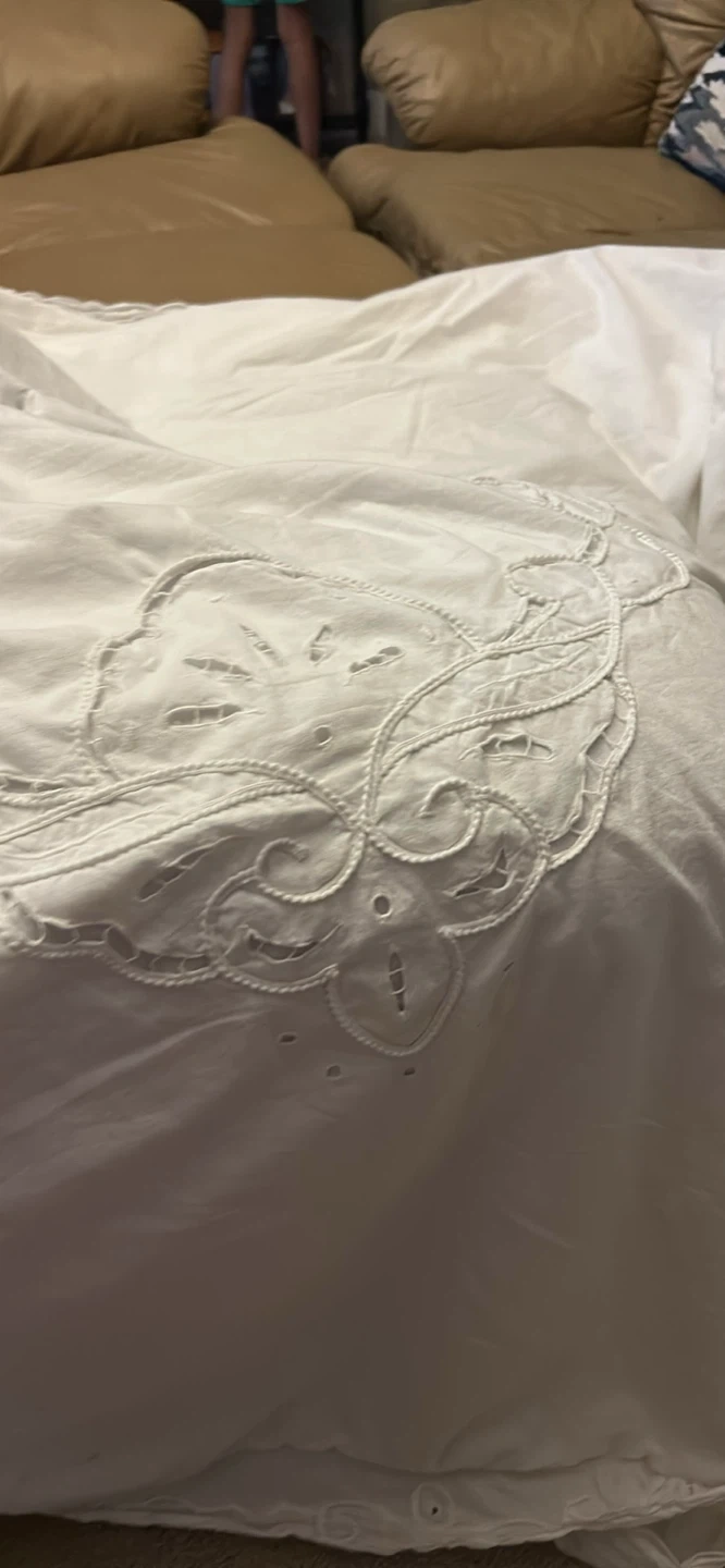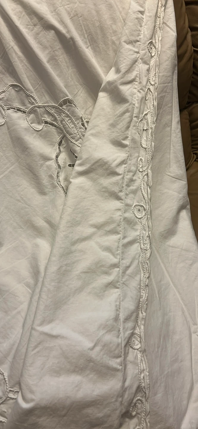 This is a lovely white duvet cover with beautiful embroidery and delicate lace trim. It's made from a comfortable fabric and will add a touch of elegance