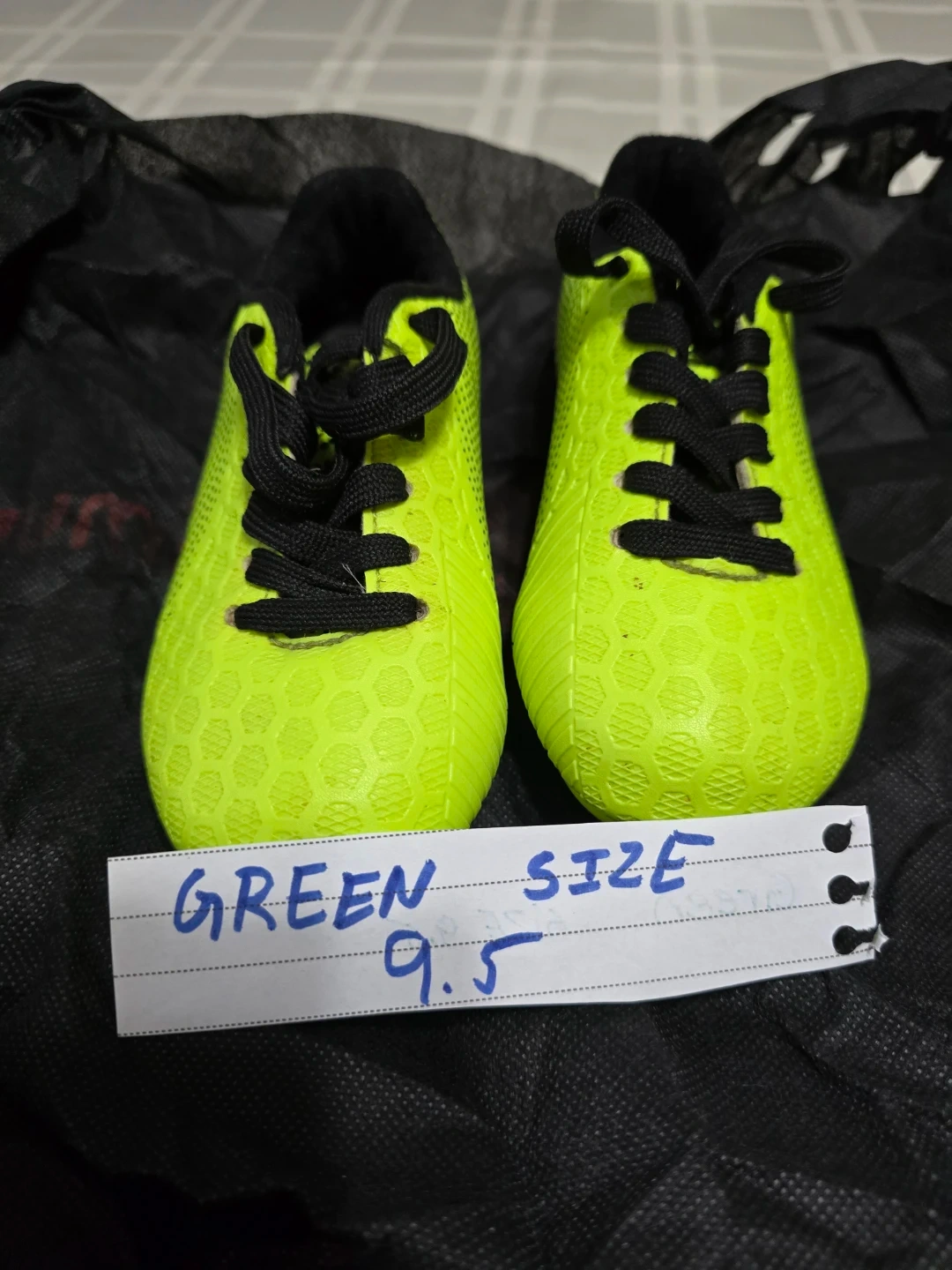 Bright green soccer cleats for kids. These cleats are size 9.5. They feature a textured upper for better ball control.
