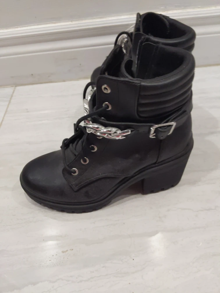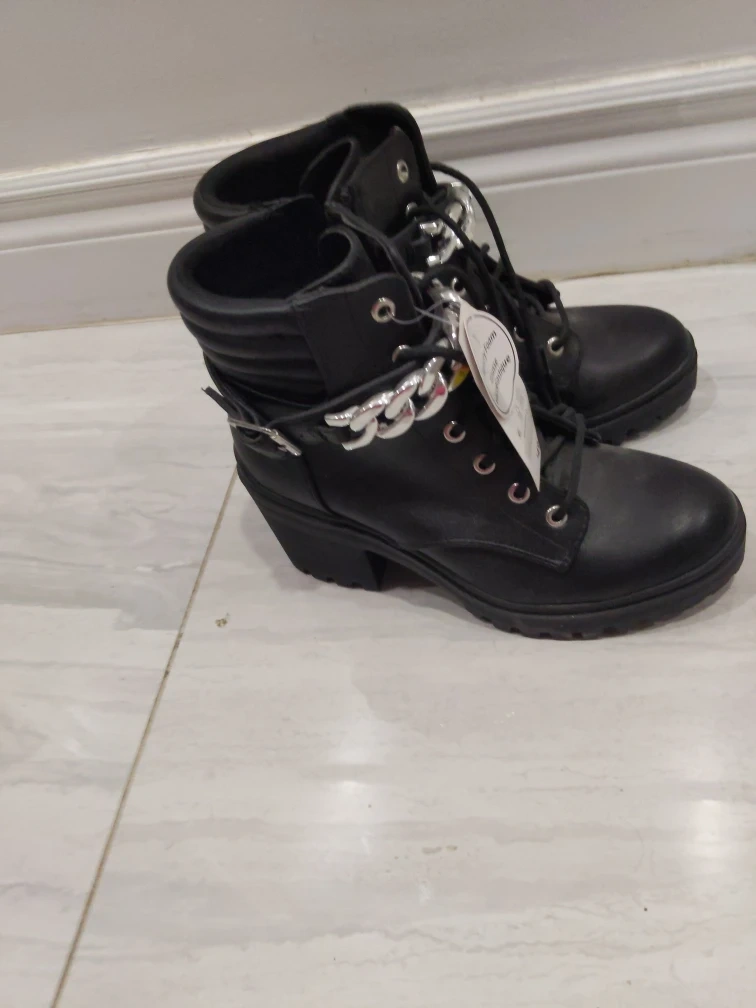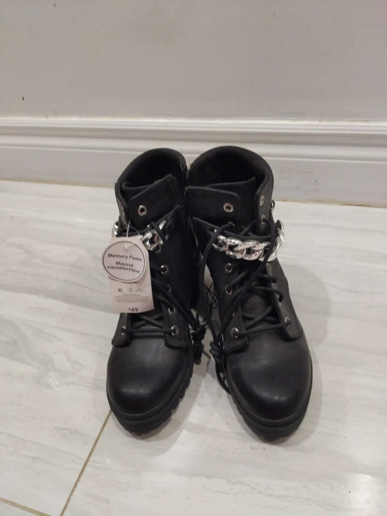 These black combat boots feature a stylish chain accent. They have a comfortable memory foam insole. Lace-up front with side zipper closure.