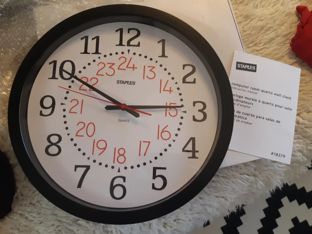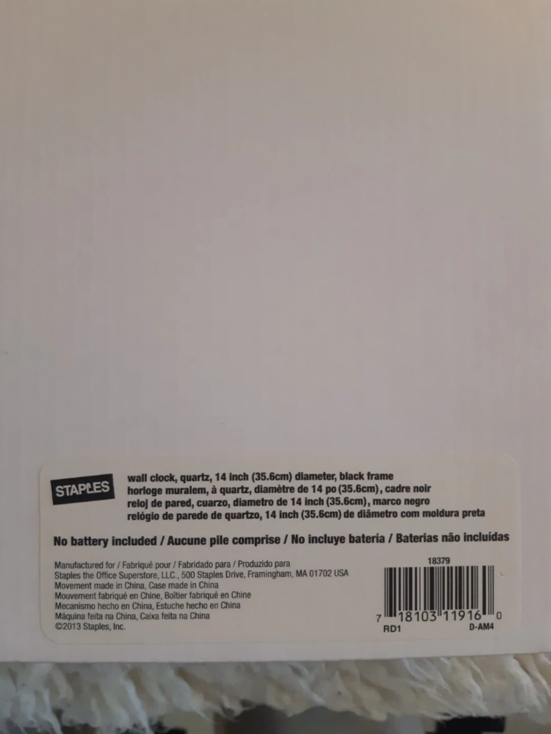 This is a Staples wall clock with a black frame. It's a quartz clock and measures 14 inches in diameter. The dial shows both 12-hour and 24-hour time formats, making it handy for tracking different schedules. It's great for a home office or classroom!