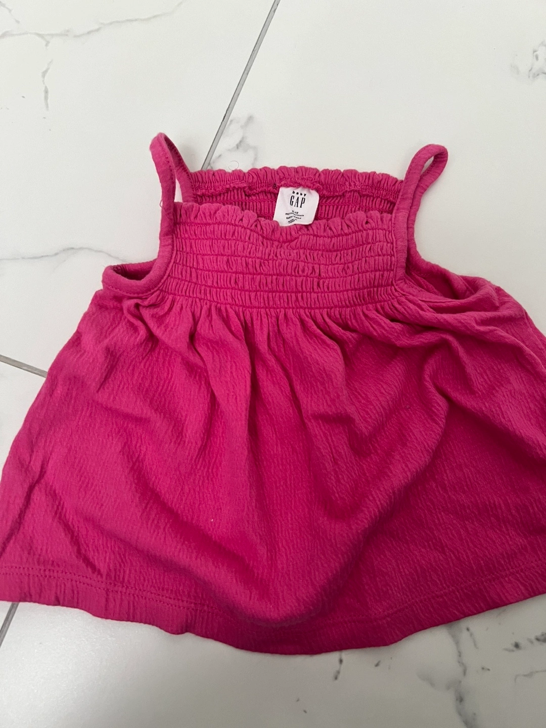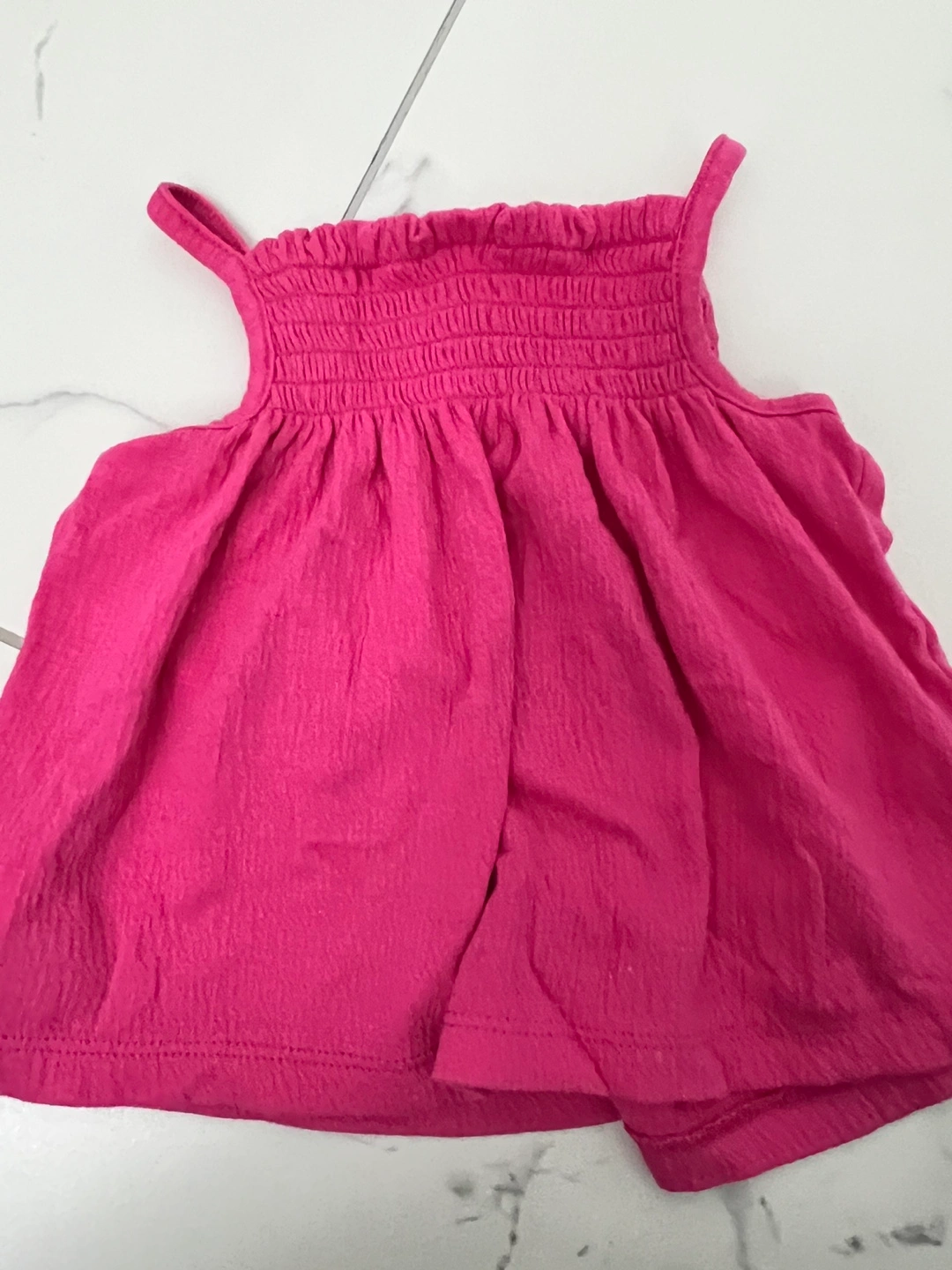 Bright pink dress with small straps. Elasticated bodice. Can be worn during a warm sunny day, bringing comfort and joy.