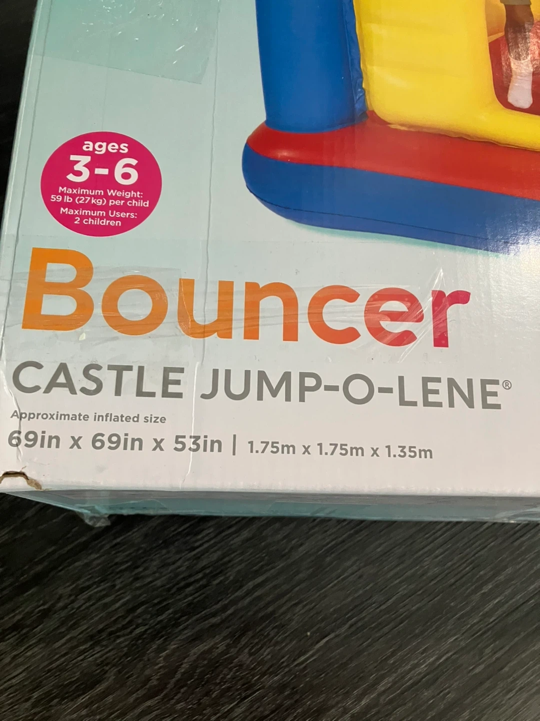 This Intex Castle Jump-O-Lene bouncer is great for kids aged 3-6. It has an approximate inflated size of 69in x 69in x 53in. Maximum weight limit is 59 lb (27 kg) per child with a maximum of 2 children.no pump.