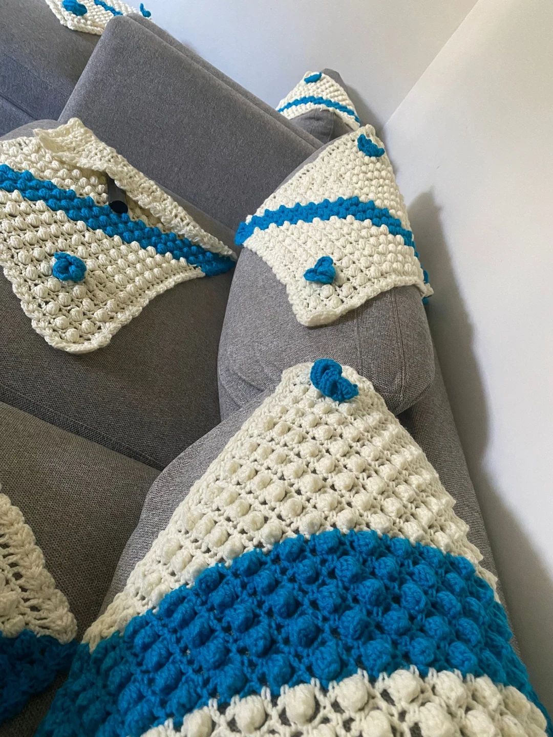 Set of handmade crocheted doilies and placemats. Features red rose and green leaf embellishments. Includes oval and round pieces in mint green, as well as a green and cream oval table runner with red roses. Also includes a set of crocheted coasters and a crocheted piece with blue and white stripes. Adds a decorative touch to any table!