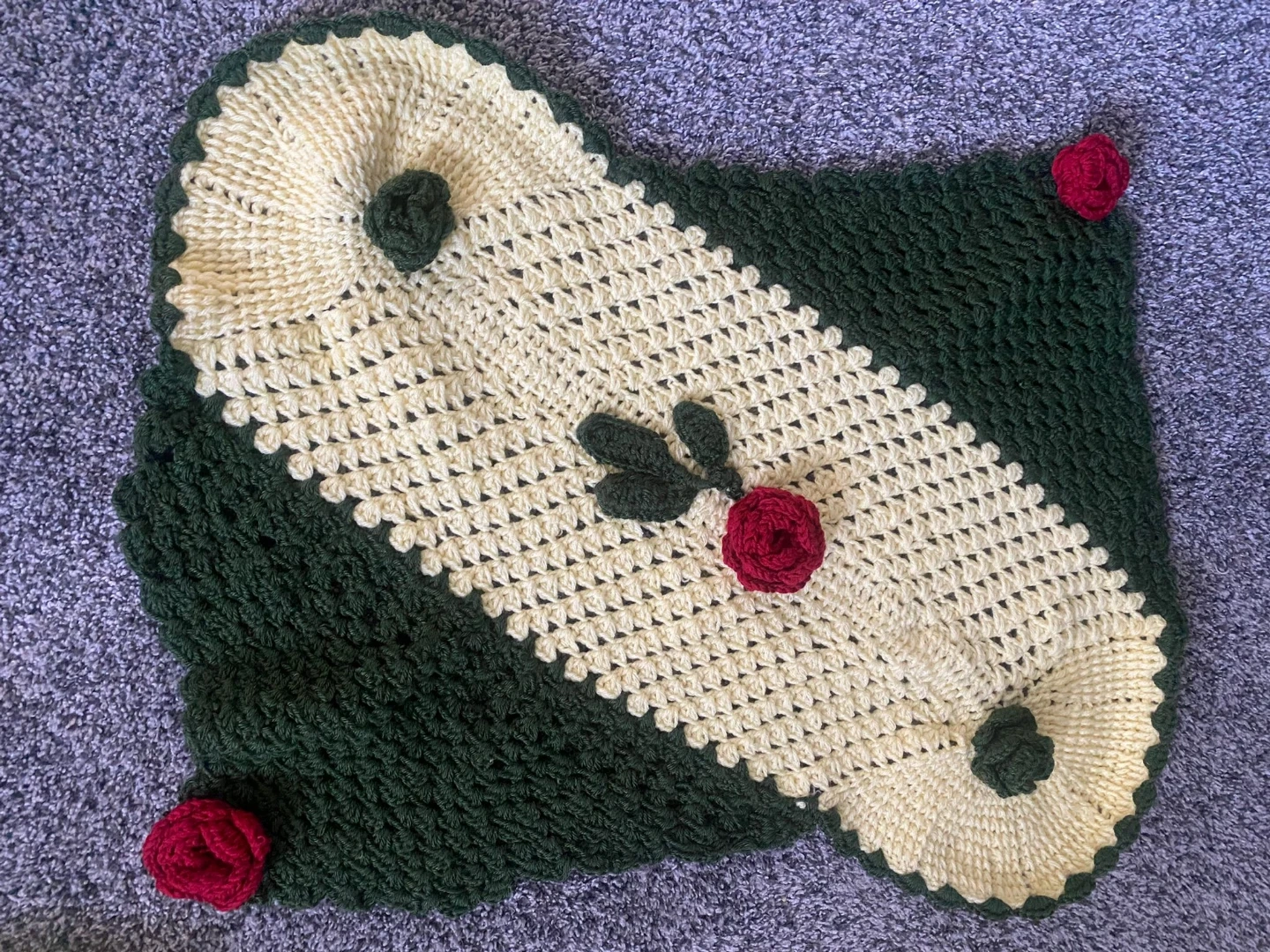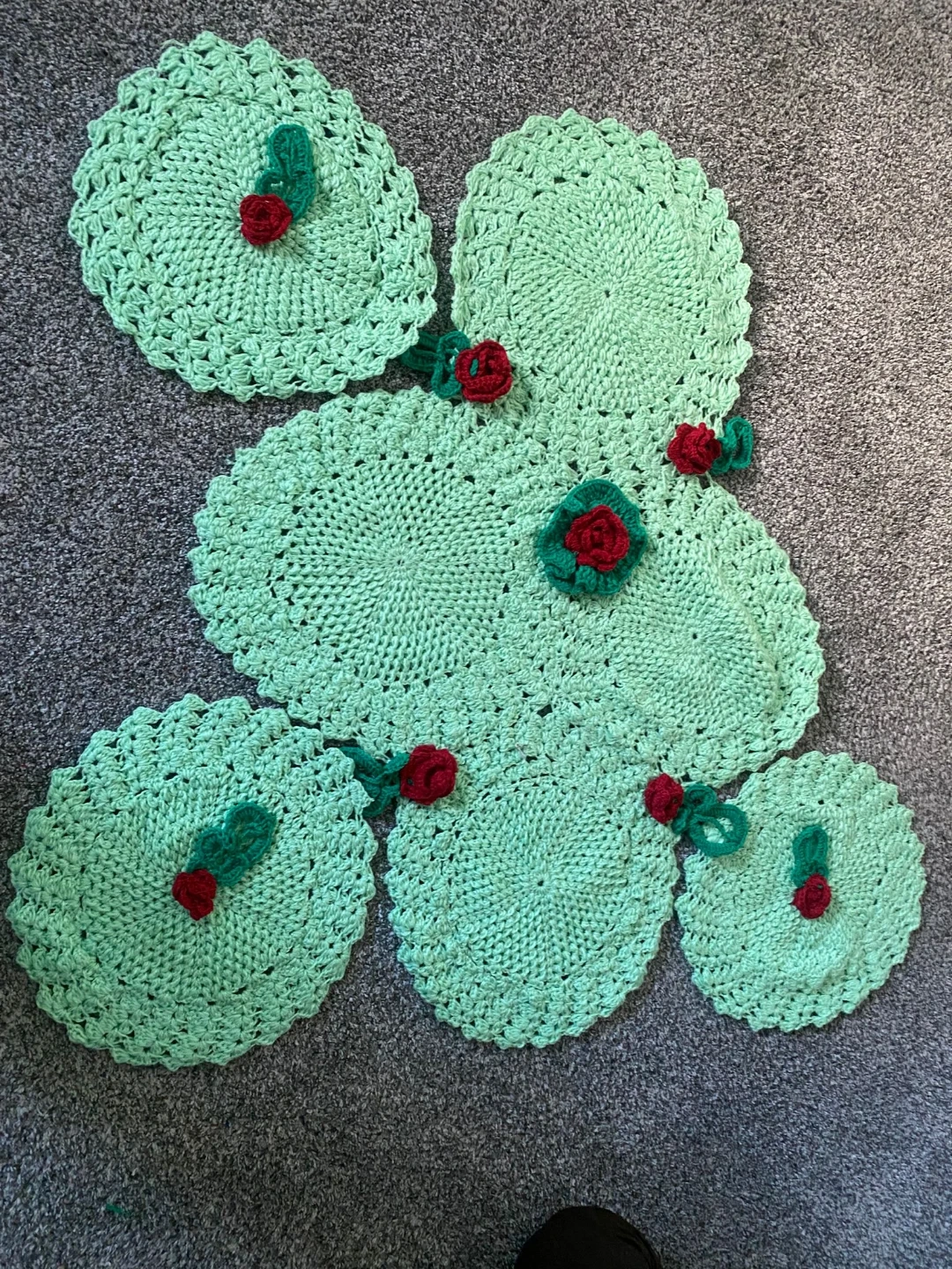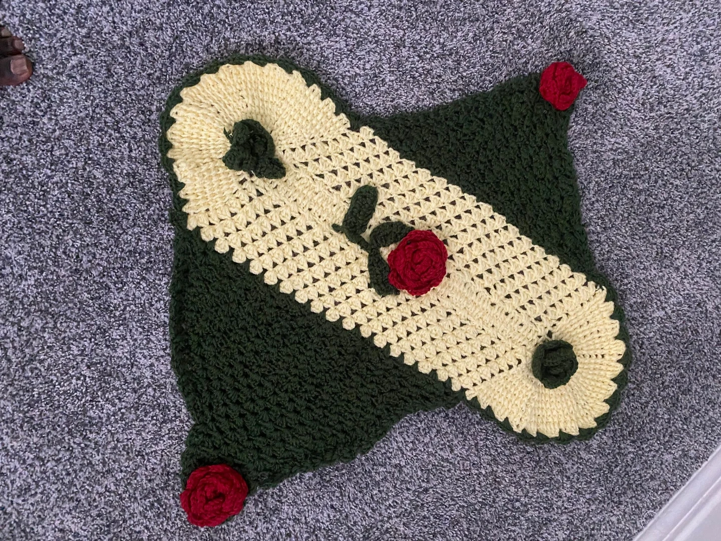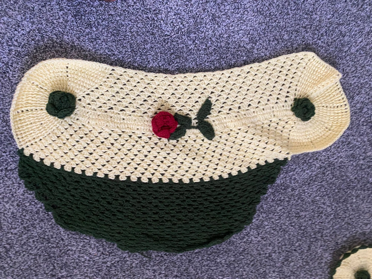 Set of handmade crocheted doilies and placemats. Features red rose and green leaf embellishments. Includes oval and round pieces in mint green, as well as a green and cream oval table runner with red roses. Also includes a set of crocheted coasters and a crocheted piece with blue and white stripes. Adds a decorative touch to any table!